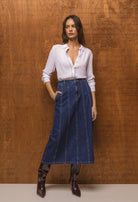 Classic meets cool in the DeeDee Dark Rinse Skirt—a structured denim circle midi designed for effortless elegance. Crafted from 100% cotton, it features subtle seam detailing that flatters every curve while maintaining that iconic vintage silhouette.