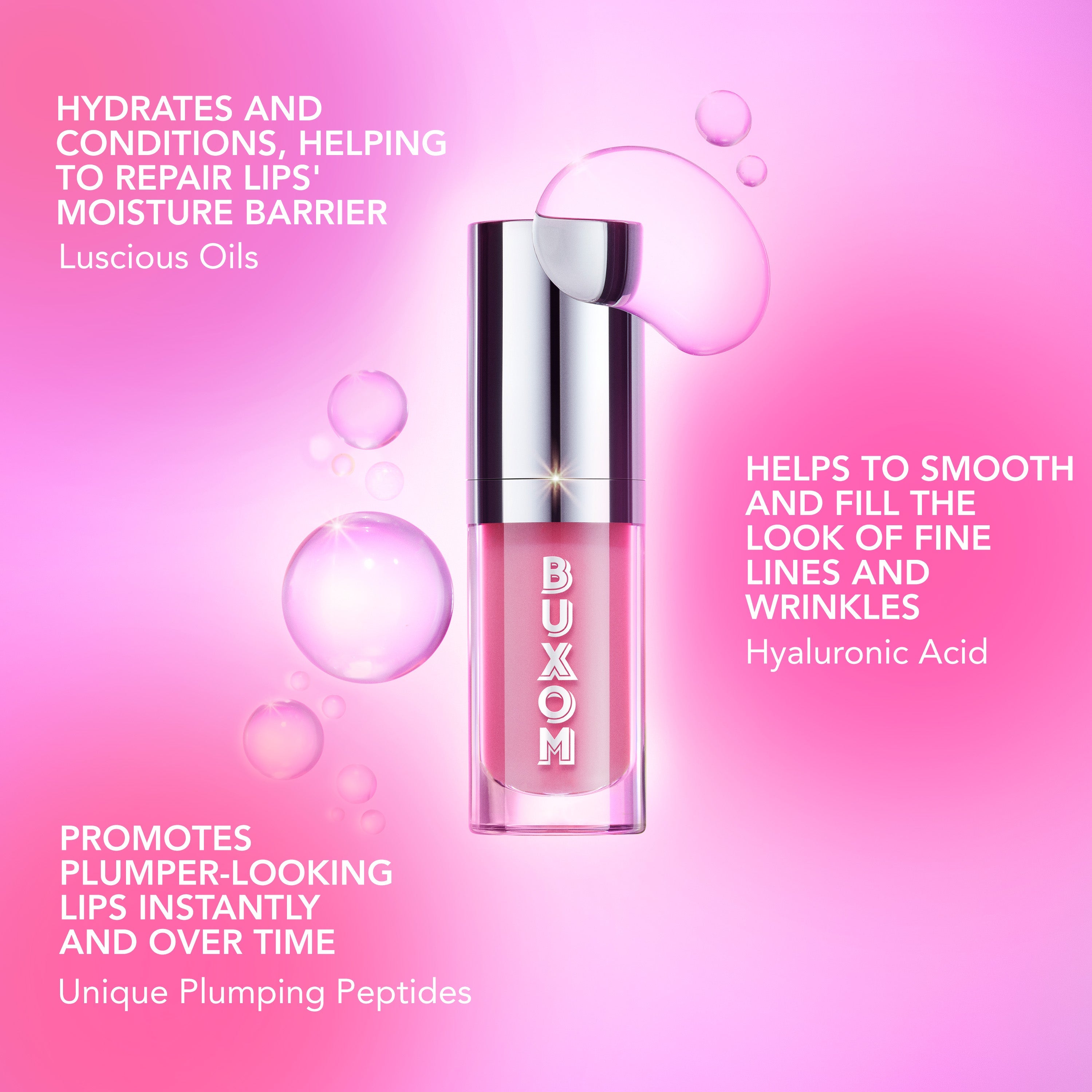 BUXOM's Full-On iconic plumping formula in a super shiny lip oil gives non-sticky, all day juicy hydration plus a pillowy plump instantly and over time.
