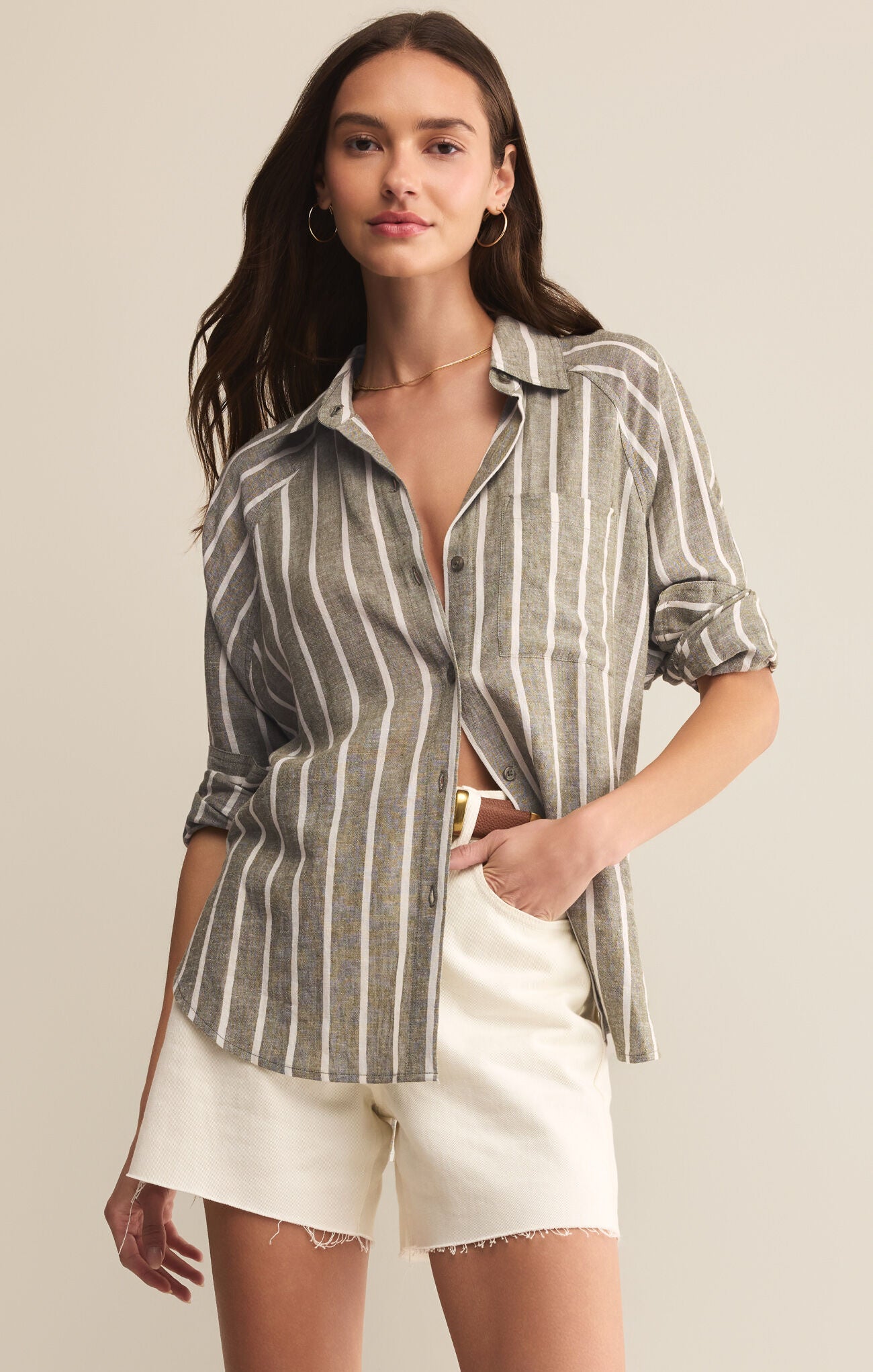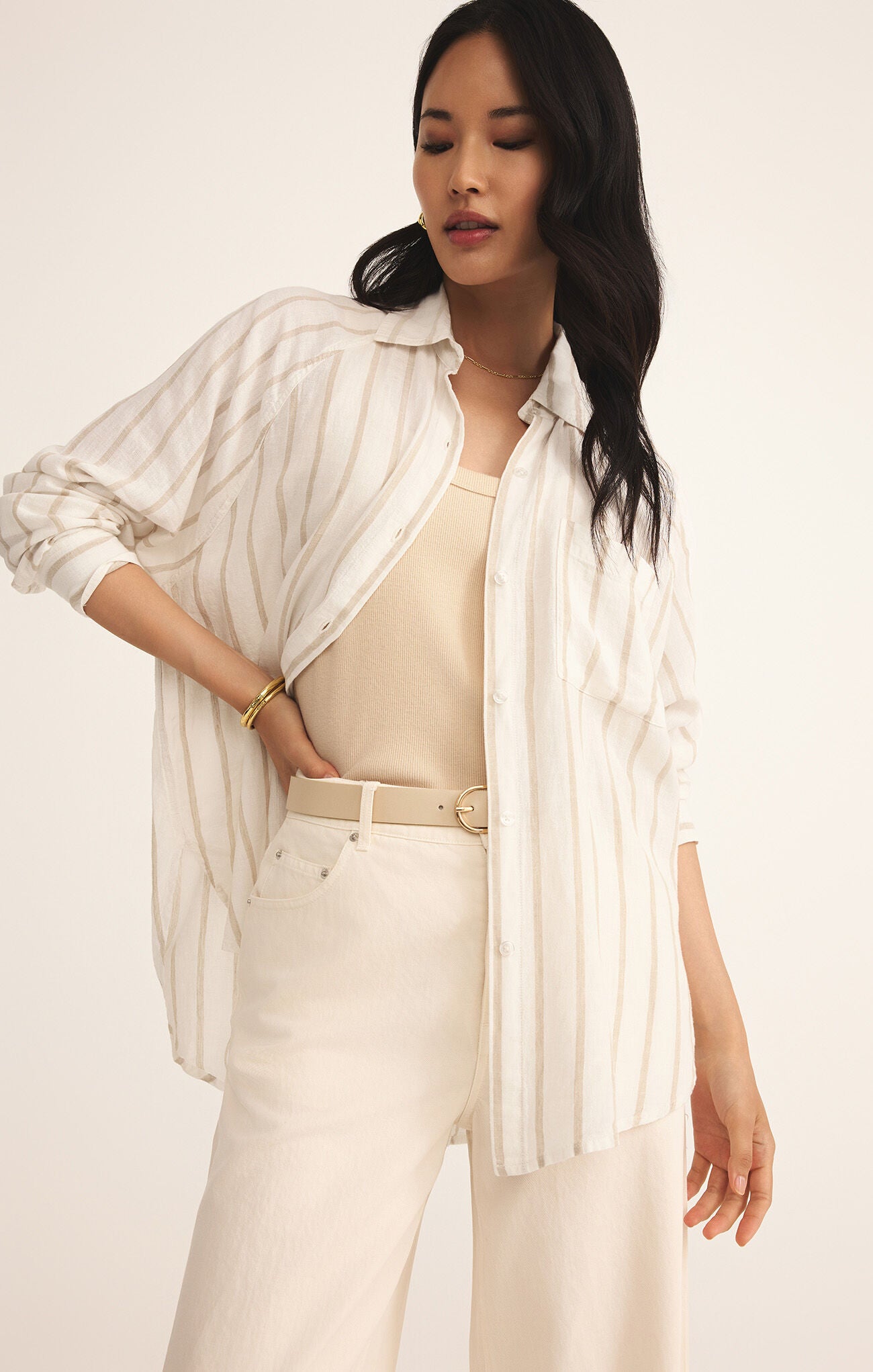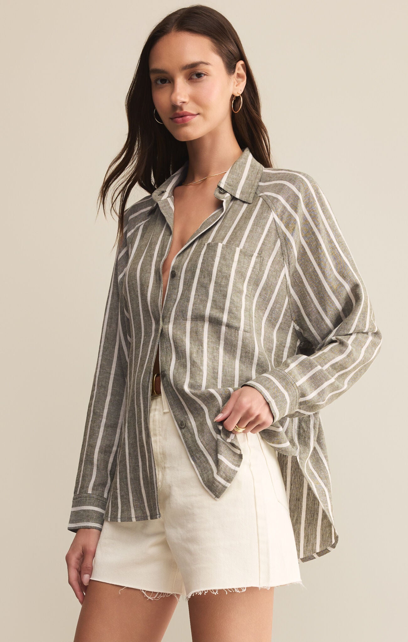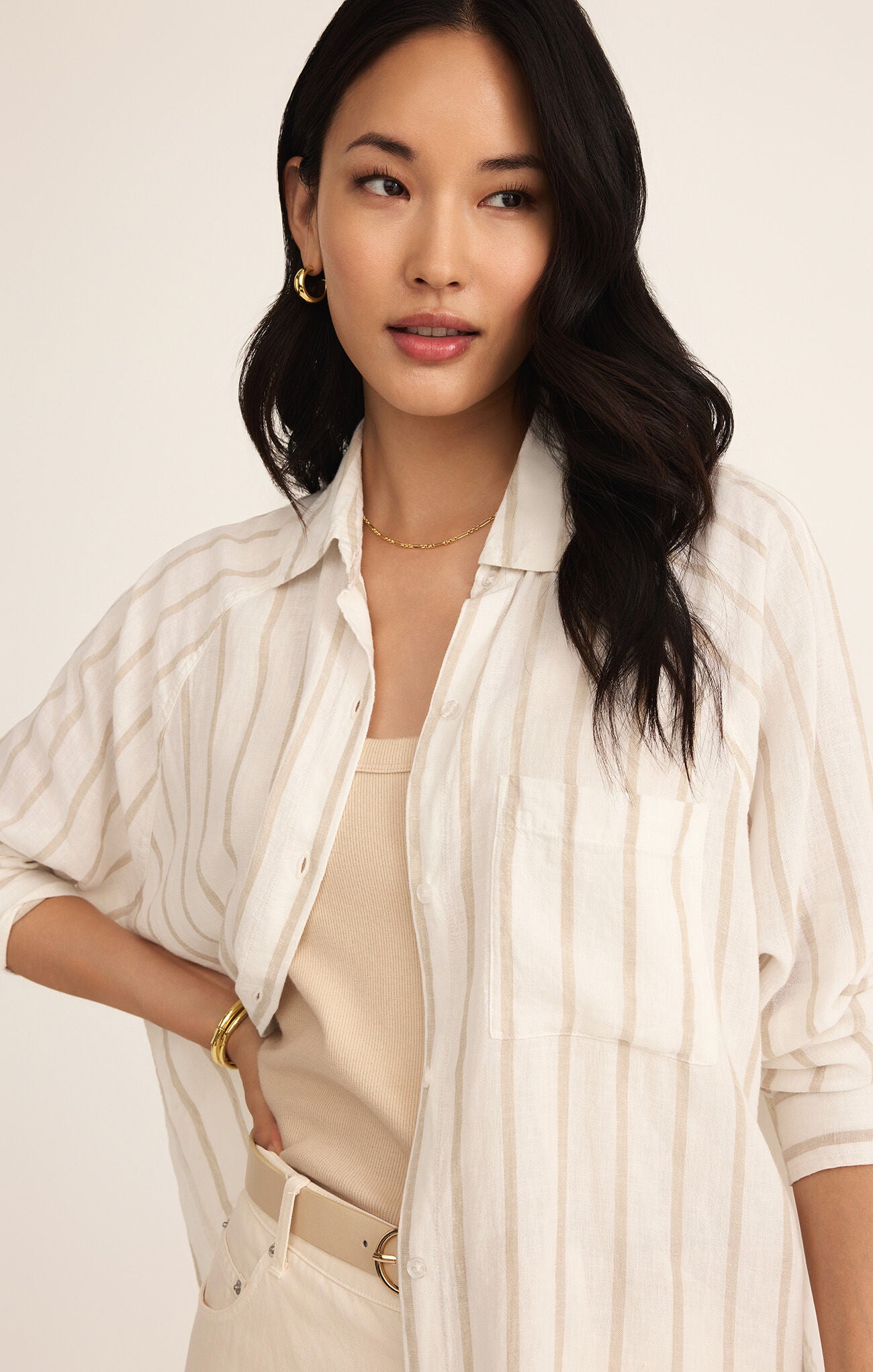 You'll love the easy, breezy comfort of this classic stripe button-up. The Perfect Striped Linen Top has that soft, drapey feel you look for when the temps start rising. Throw it on over a tank, swim suit or bralette for an effortless look no matter where you are.