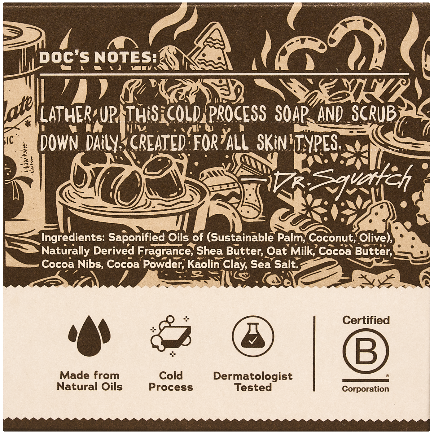 Ingredients: Saponified Oils of (Sustainable Palm, Coconut, Olive), Naturally Derived Fragrance, Shea Butter, Oat Milk, Cocoa Butter, Cocoa Nibs, Cocoa Powder, Kaolin Clay, Sea Salt.
