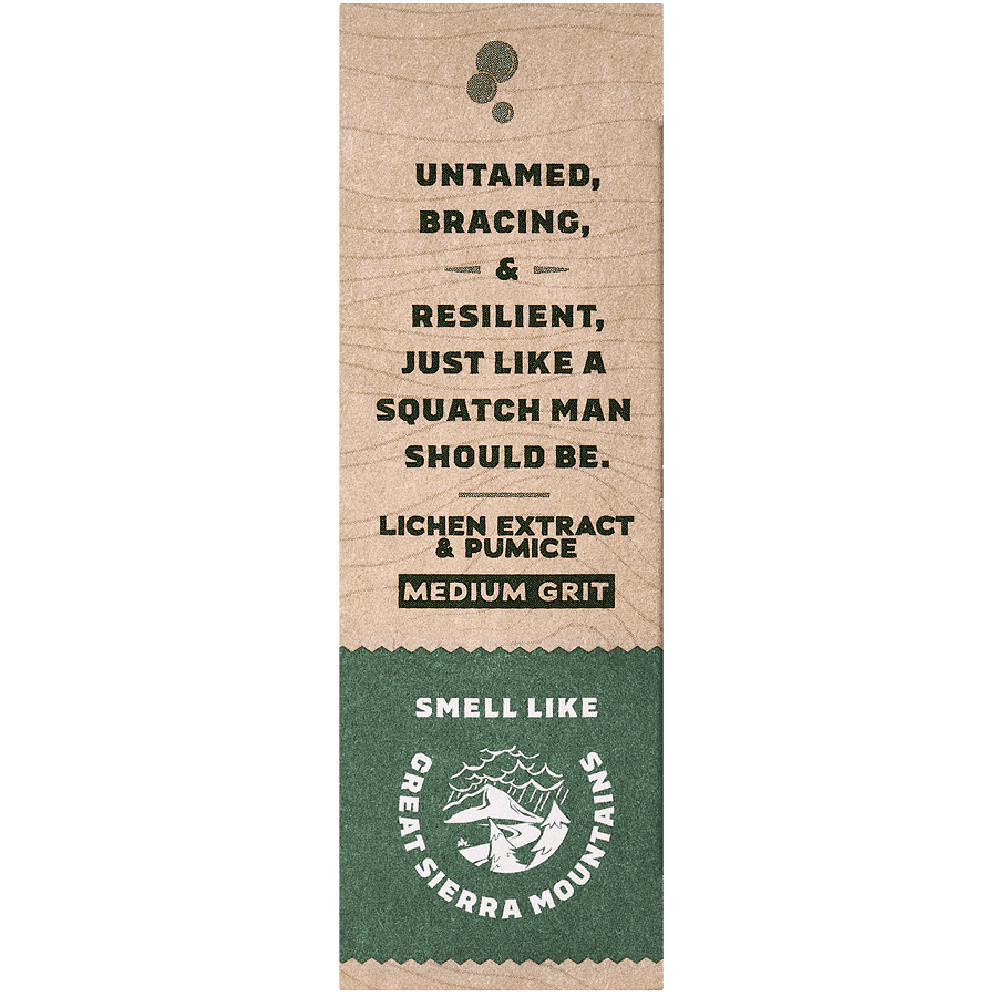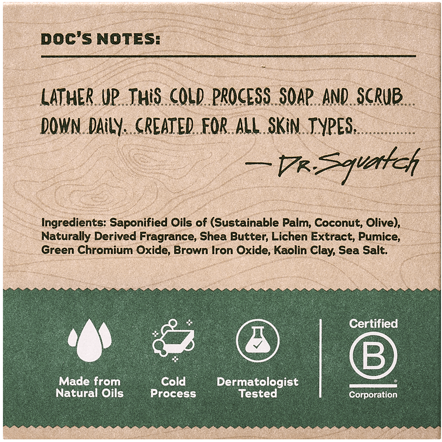 Saponified Oils of (Sustainable Palm, Coconut, Olive), Naturally Derived Fragrance, Shea Butter, Lichen Extract, Pumice, Green Chromium Oxide, Brown Iron Oxide, Kaolin Clay, Sea Salt