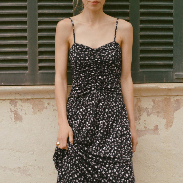 Soft, stretchy, with a feminine floral touch, this fitted maxi dress features a ditsy print, sweetheart neckline, adjustable straps, and smocking for a flattering fit. Side seam pockets add an easygoing twist to the polished silhouette.