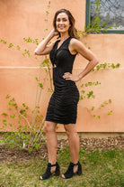 Be comfy and chic in the Summer Nights Black Dress! We are absolutely swooning over the ruched detail on the front, side, and back seams that hug the figure perfectly. A small cutout at the waist, ties that cinch in the fabric at the bust and a v-neckline are elements that make this gorgeous dress stands out! Throw on your favorite heels and you'll be ready for a night out!