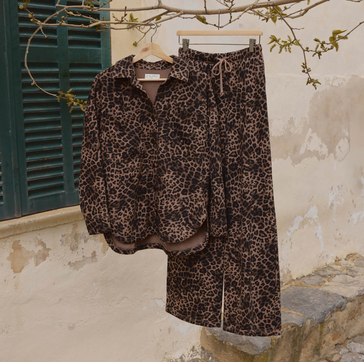 This cotton French Terry shirt jacket brings a soft, lived-in feel with a playful leopard print that stands out. Finished with a button front and patch pockets, it’s the perfect layer to throw on for a little extra edge on cooler days.