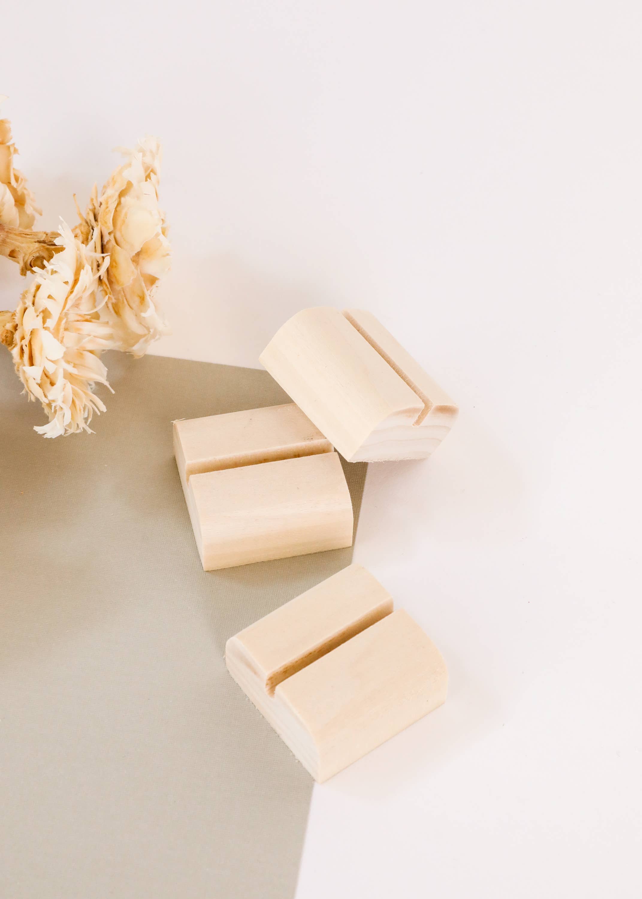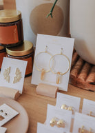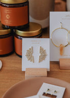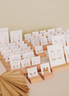 Wooden displays stand to showcase a single pair of earrings on a card.