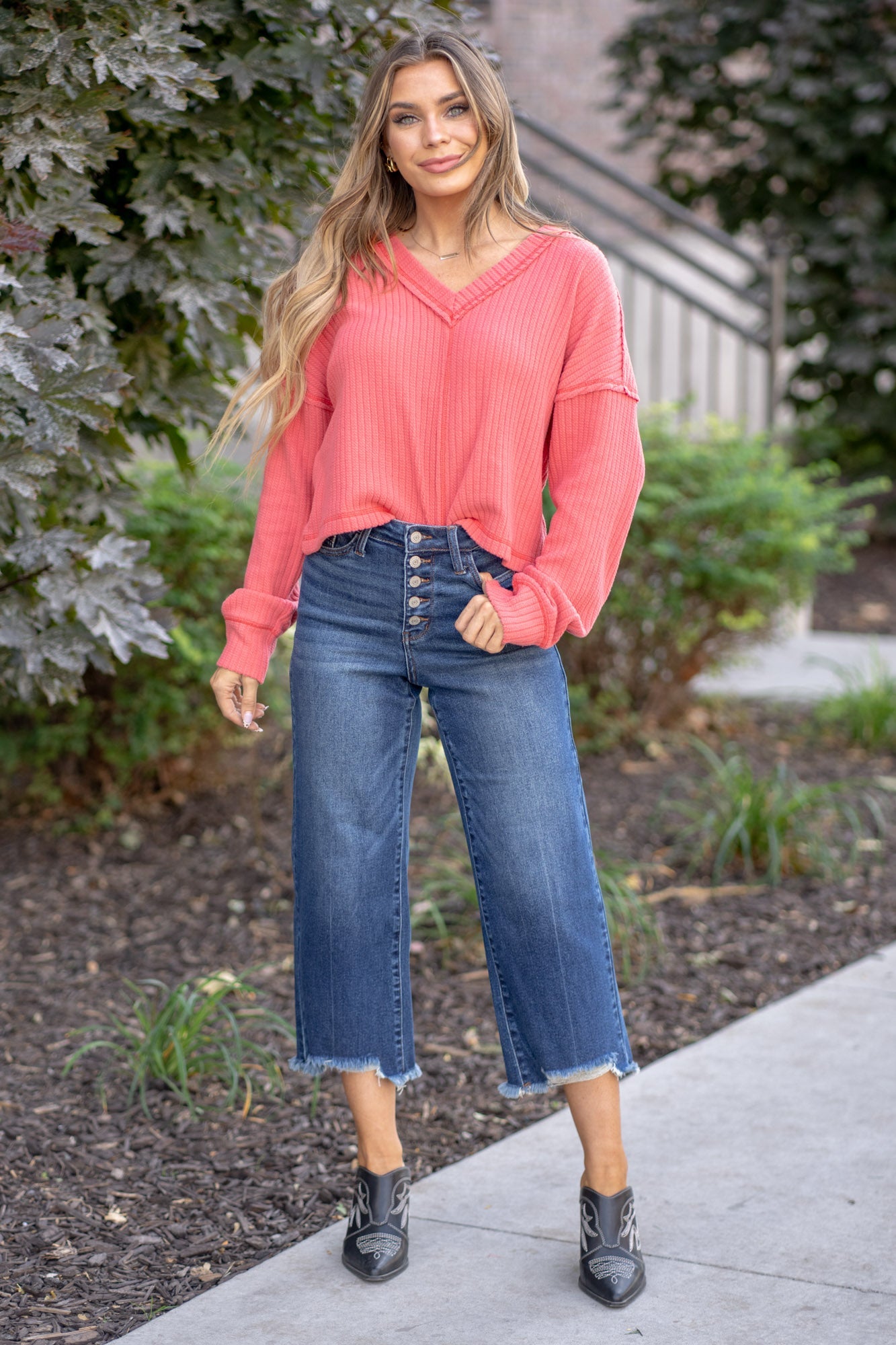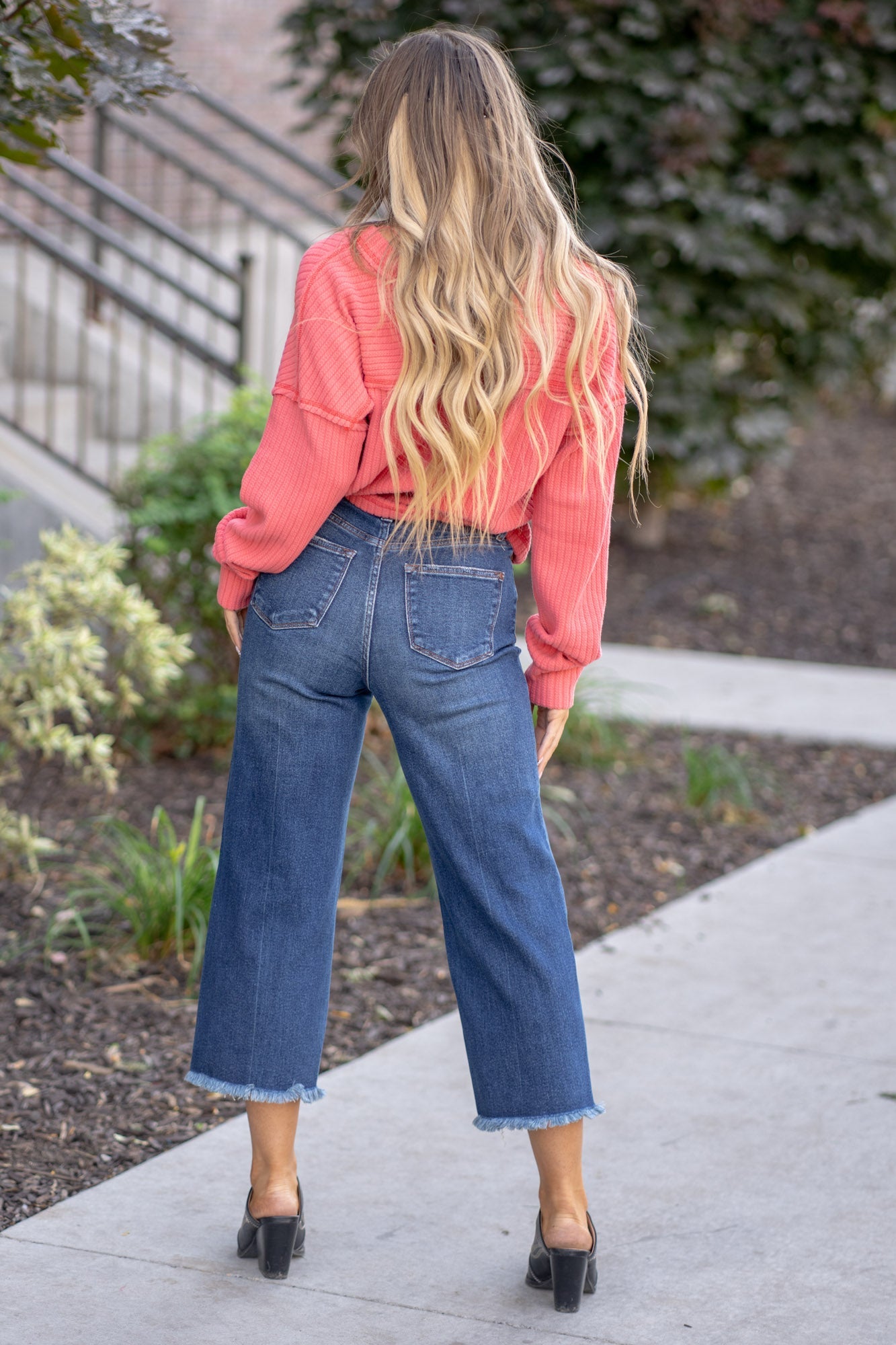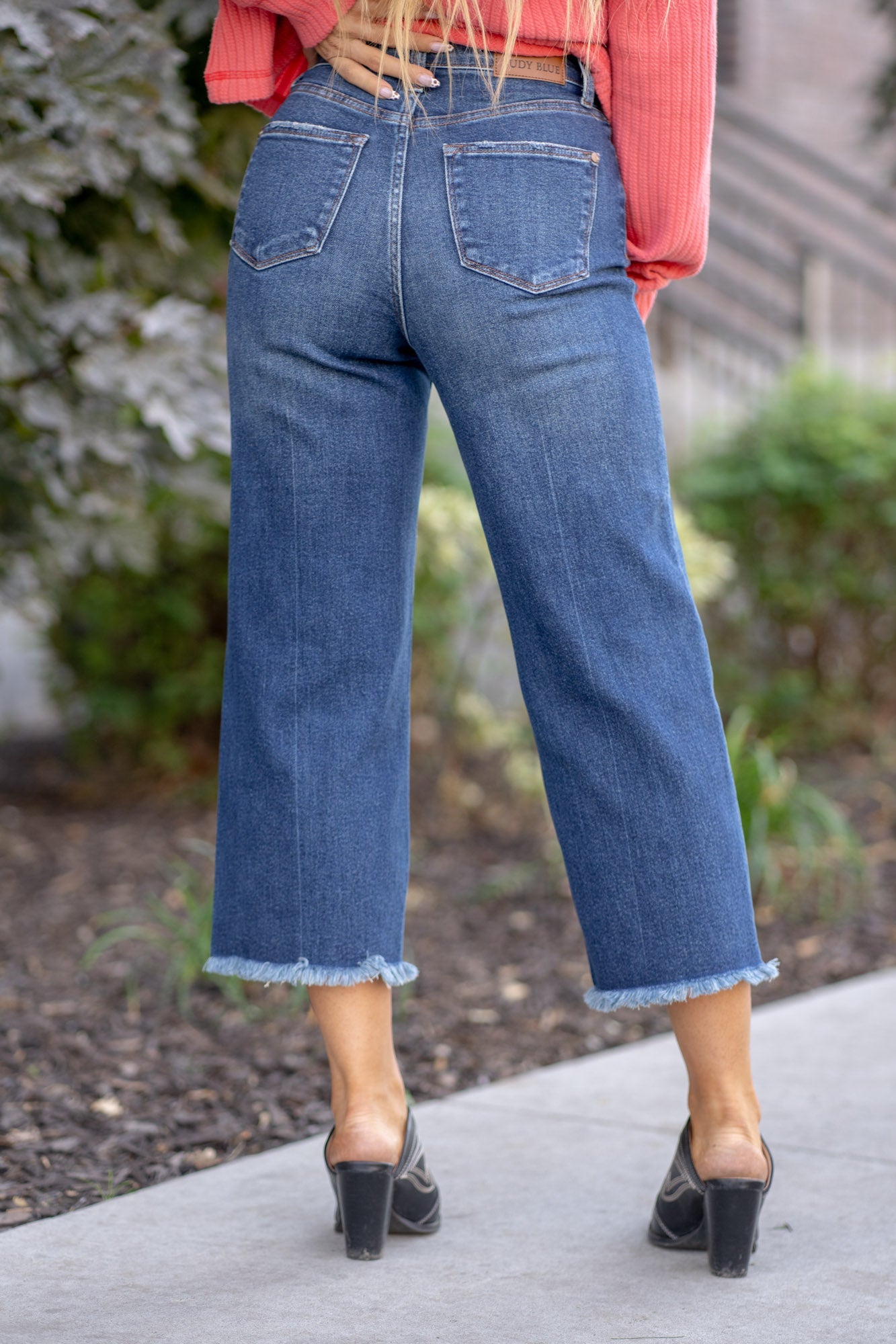 Say hello to your new favorite jeans - the Adeline Wide Leg Crop! These medium wash jeans feature a high rise, trendy button fly, and a raw hem for a relaxed, yet stylish look. Step out in confidence and comfort with these wide leg crop jeans.