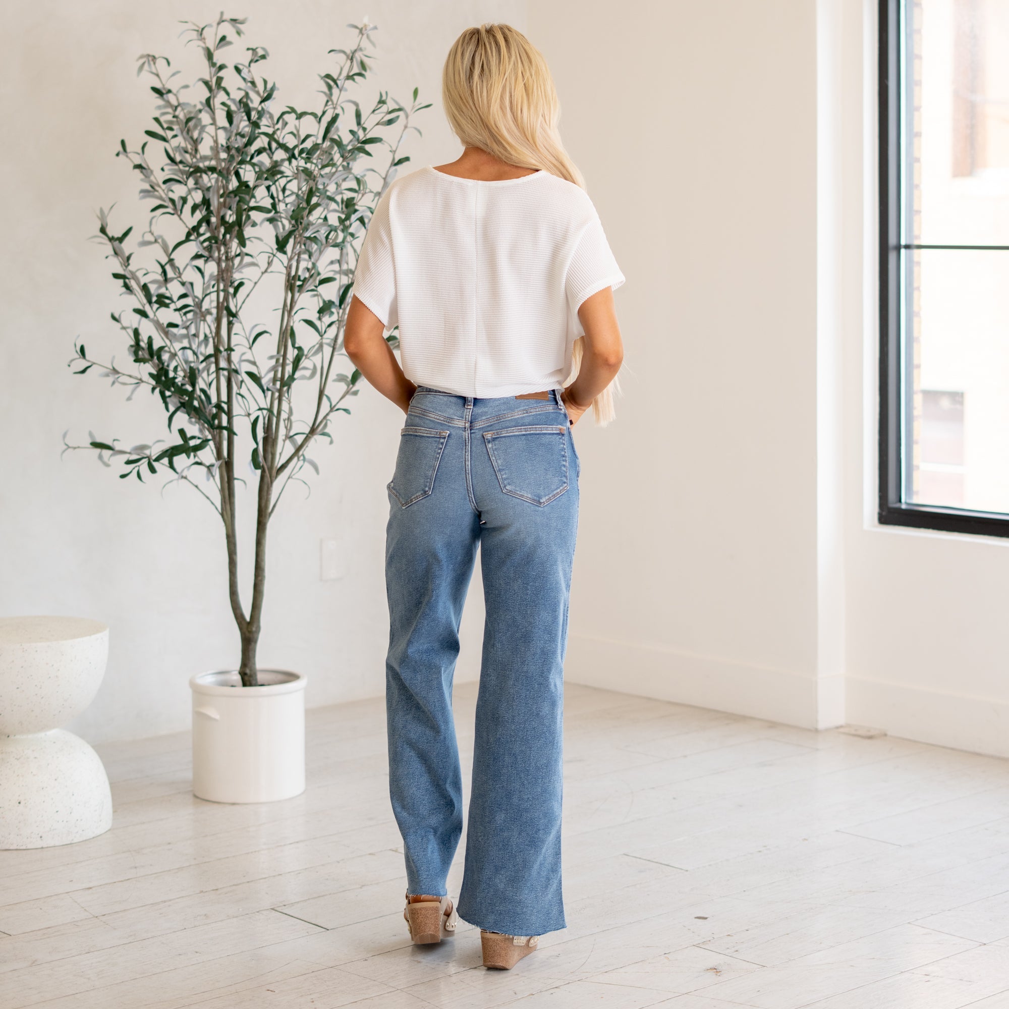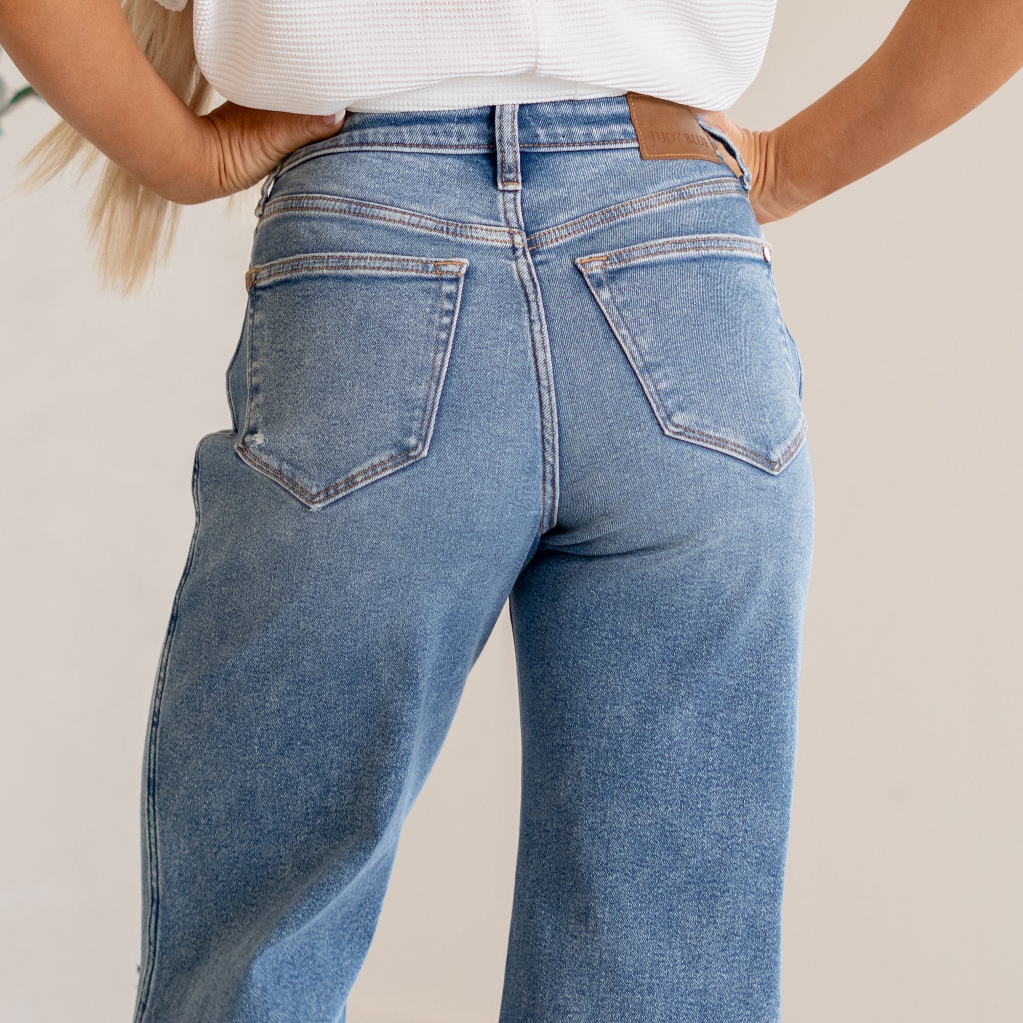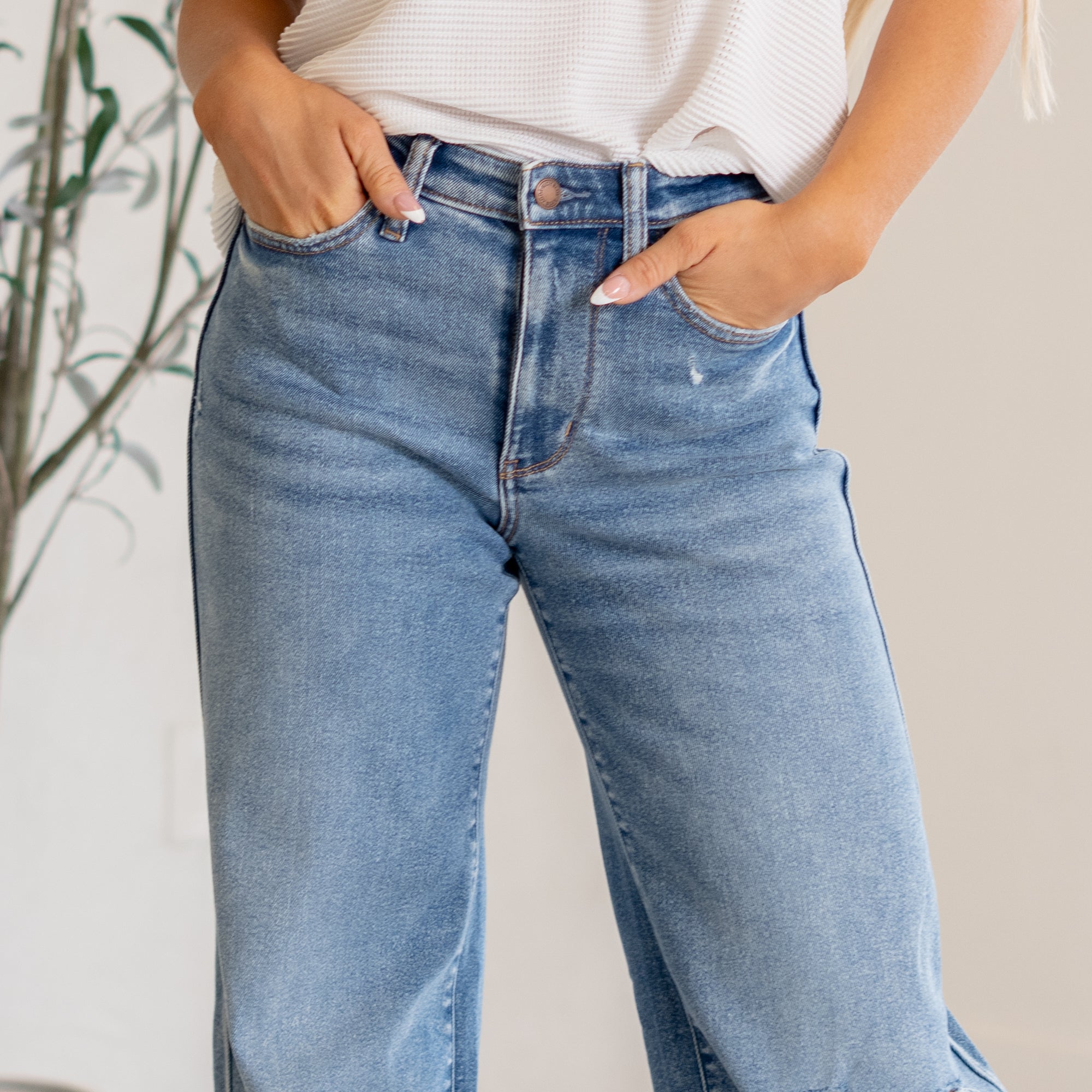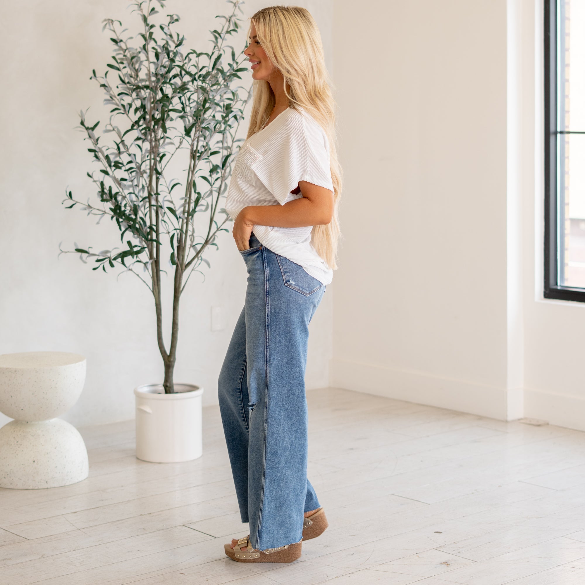 Elevate your denim game with our BELLA WIDE LEG DISTRESSED JEAN. These high waisted jeans offer a flattering fit with a touch of stretch for comfort. The medium wash and knee distressing add an edgy touch to the wide leg silhouette. Functional pockets and a zipper button closure make these jeans a must-have for any wardrobe. Unlined for a lightweight and effortless feel.