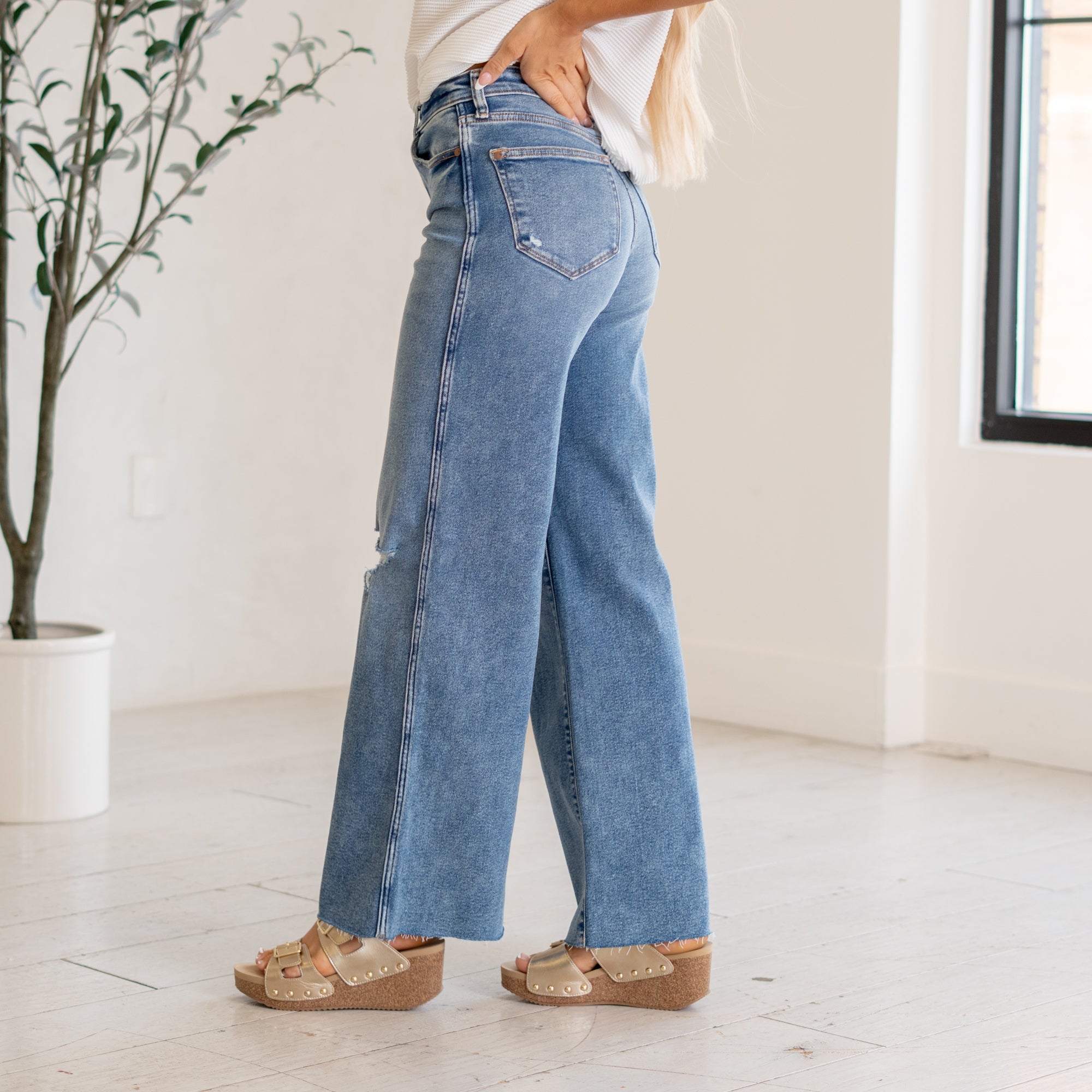 - High Waisted Distressed Wide Leg Jeans Medium Wash