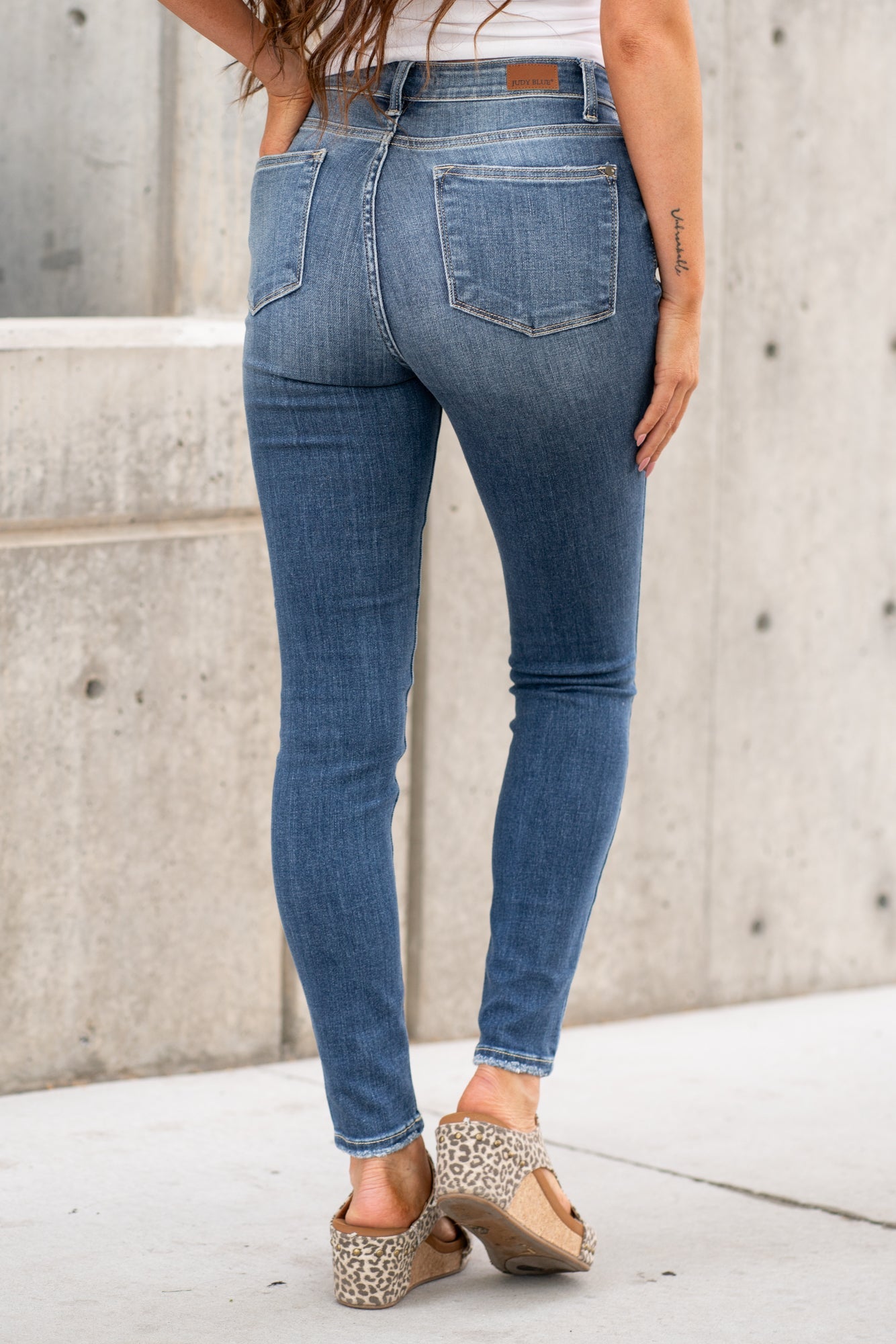 Introducing Chelsie Button Fly Skinny Jeans - your new favorite go-to pair! The medium wash and high rise design are perfect for any occasion, while the button fly adds a touch of unique style. Say goodbye to distressed jeans and hello to timeless comfort.