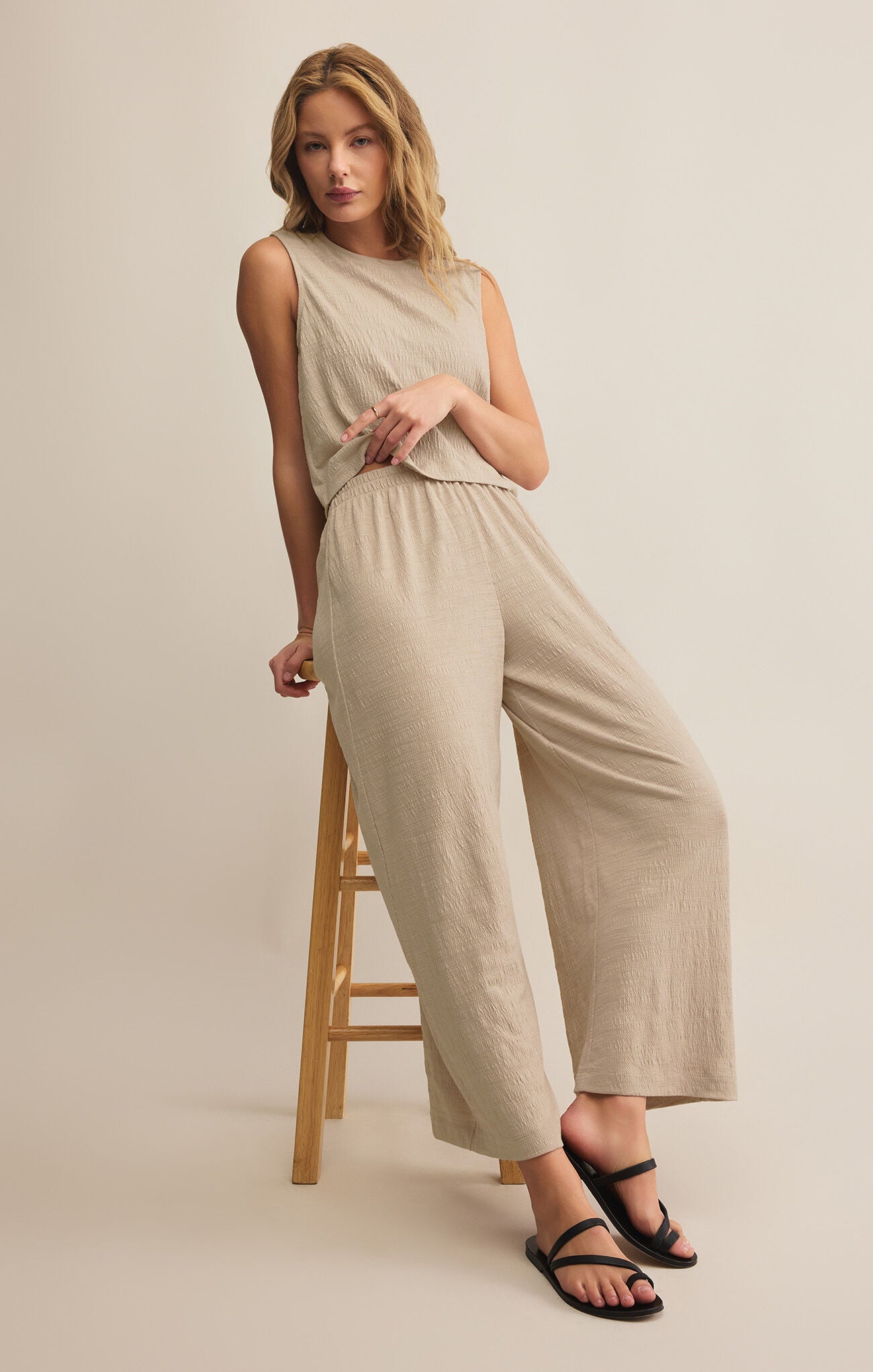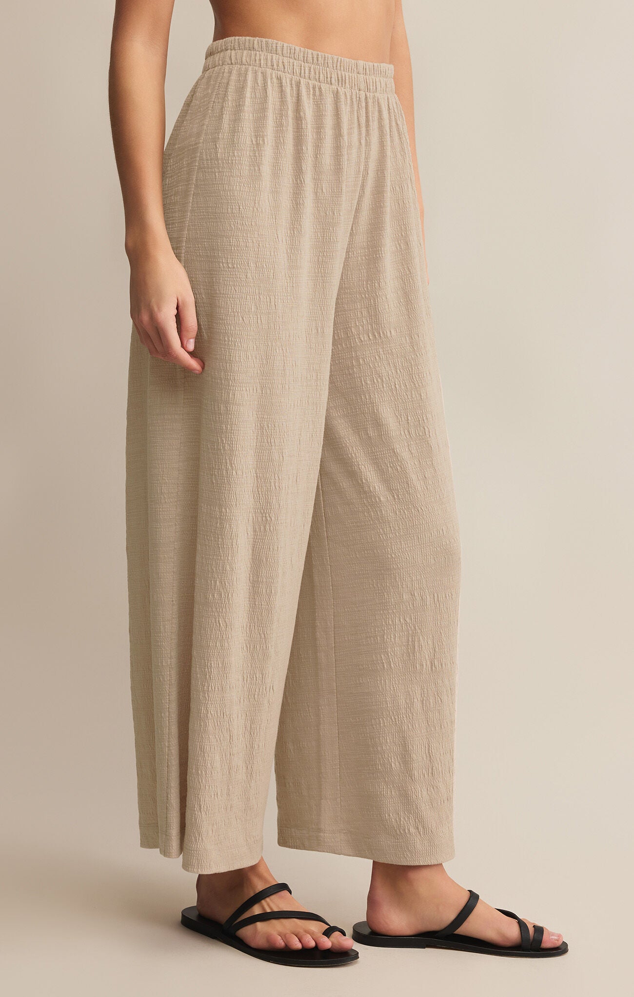 Crafted from textured slub knit fabric, these high-rise, wide-leg pants are as breezy as they are chic. With an elastic waistband, they’re ankle-length perfection for easy, everyday wear.