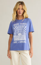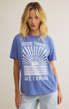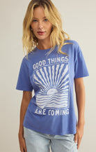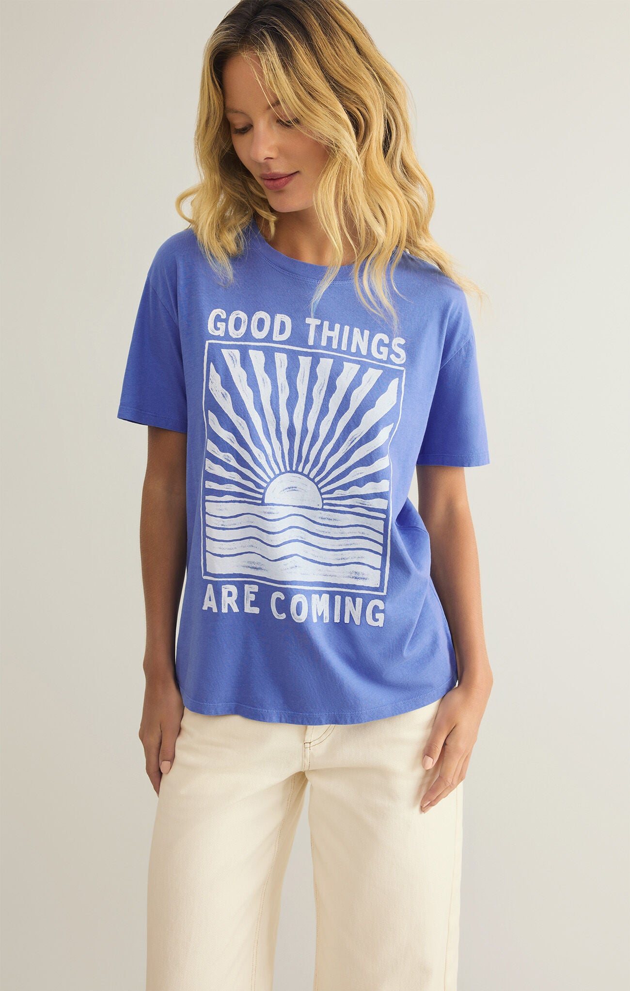 Get ready for good things with our Good Things Boyfriend Tee! Featuring a relaxed fit and soft, lightweight cotton jersey, this tee is perfect for enjoying the sunrise on the ocean. Its vintage wash adds a trendy touch, while the crew neck and short sleeves make it a comfortable and stylish choice.