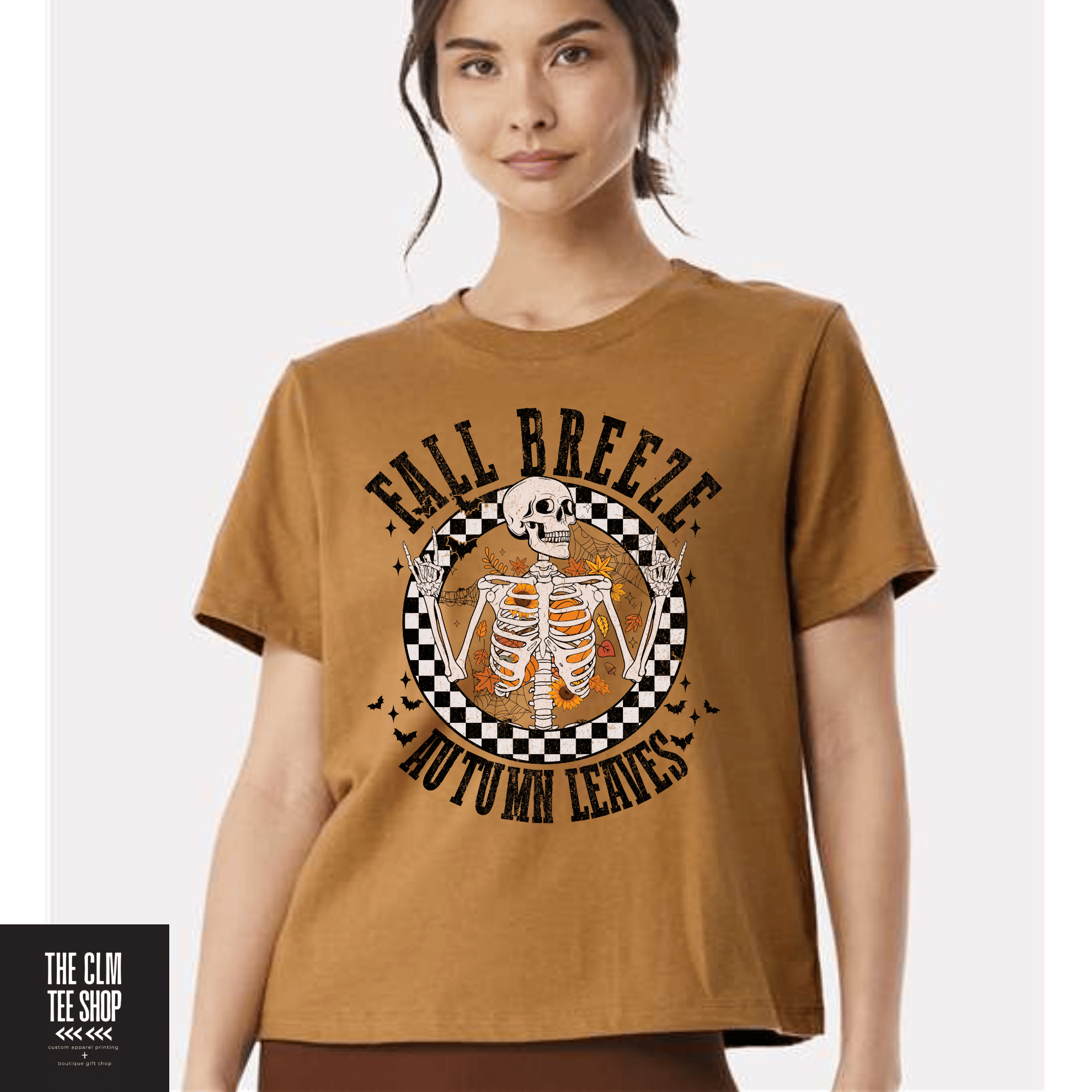 When spooky season meets cozy season, you get the Fall Breeze Autumn Leaves Tee—a little skeleton sass, autumn leaf charm, spider web detail, and a bold checkered print that pulls it all together. Basically: fall fashion, but make it edgy andcute.