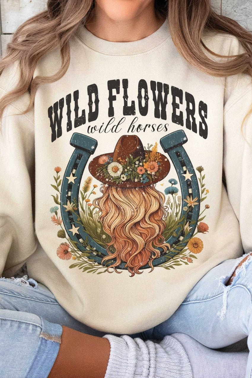 Get ready to saddle up and embrace your inner country girl with our Wild Flowers Graphic Sweatshirt. With a touch of Laniey Wilson vibes, this sweatshirt features a beautiful wild flowers graphic, perfect for any cowgirl at heart. Stay cozy and stylish with our one-of-a-kind sweatshirt. 🤠🌻🐴