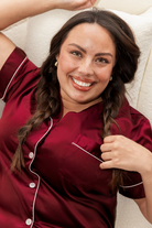 Wrapped in deep ruby tones and trimmed with crisp white piping, this buttery soft set feels like a gem in your wardrobe. Every element of these stretchy fabric pajamas were designed with intention.