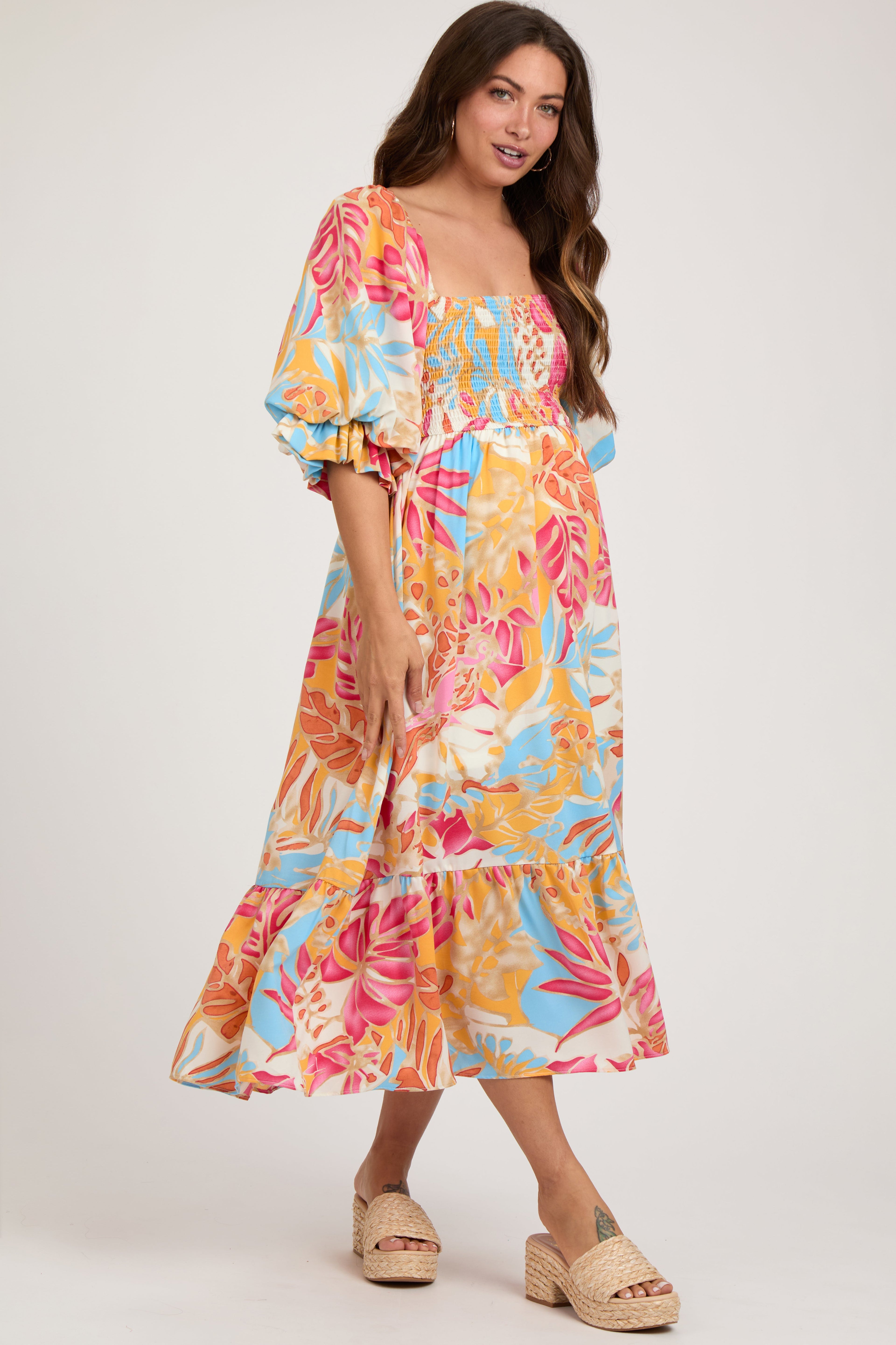A leaf print maternity midi dress with a squared neckline, a smocked top, short puff sleeves, and a gathered bottom tier.
