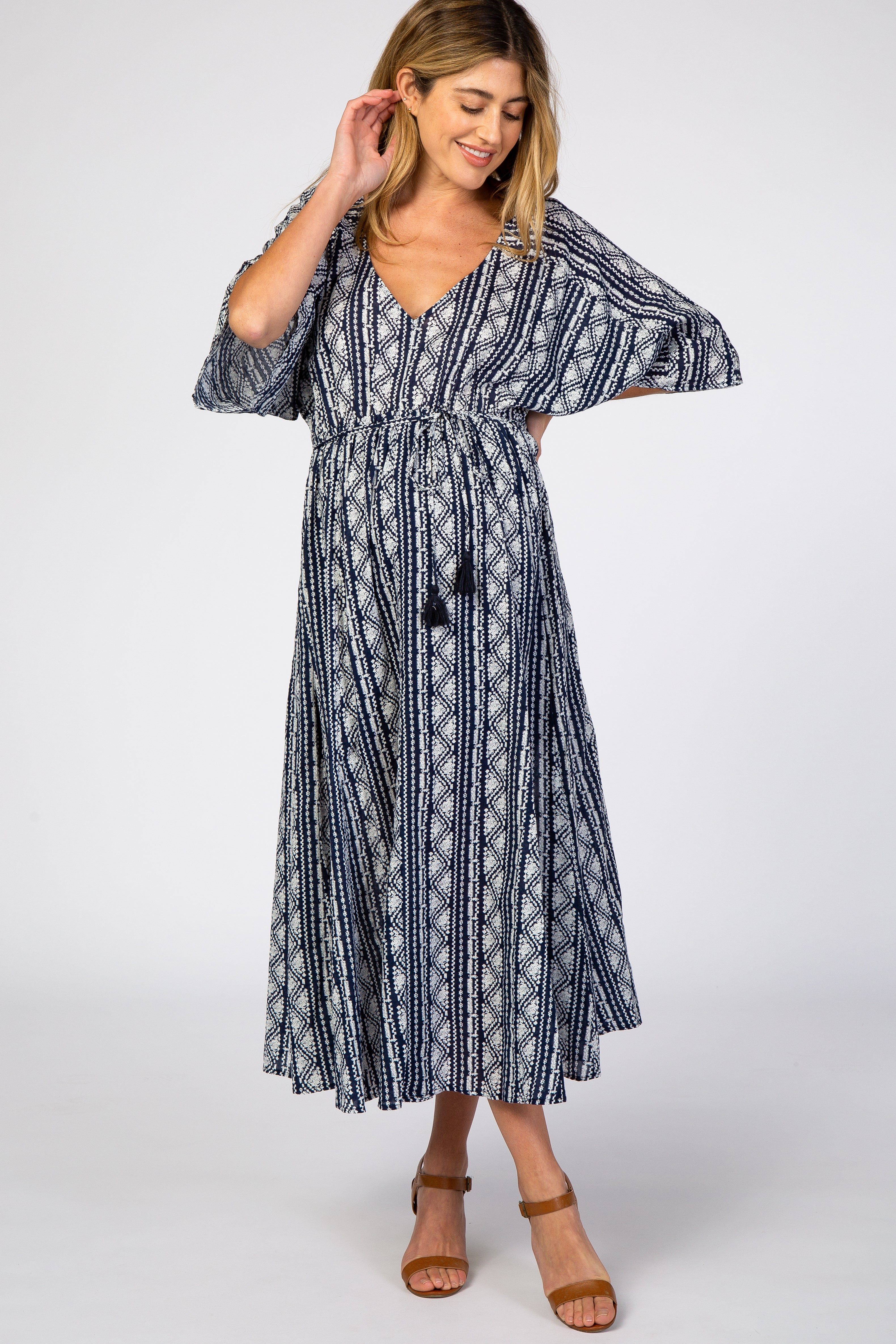 Navy Printed V-Neck Maternity Midi Dress (Online Exclusive)