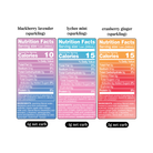 Sparkling: blackberry lavender, strawberry rose, lychee mint, cherry hibiscus, cranberry ginger, mango chili