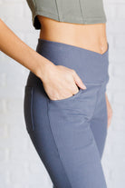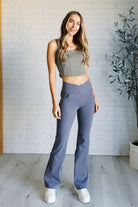Build strong style with our Twill Flared Crossover Waist Pant in Titanium. The medium stretch fabric molds to your curves while the unique V-waistline, functional front pockets, and back patch pockets add a touch of fashionable convenience. Flare out a fashion statement! (P.S. They're great for building habits too!)