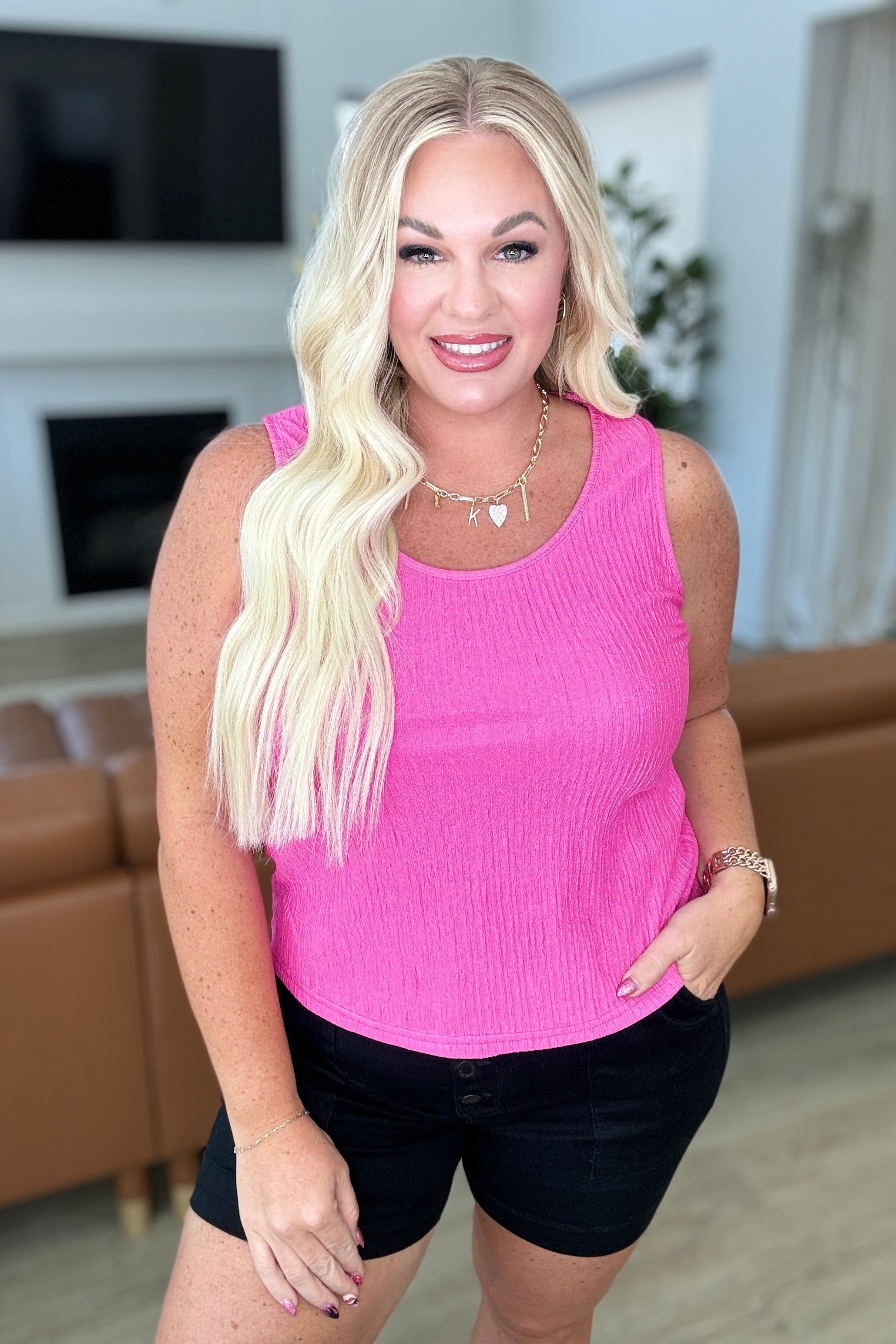 Don't fret! Our Not A Worry Textured Tank has got your back (and front)! Made with high stretch crinkle poly for the perfect layering piece. And a scoop neck for a flattering fit. Go ahead, add it to your wardrobe. You won't regret it!