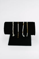 Add a touch of fun and elegance to your wrist with this playful Poised & Polished Bracelet Set in White and Gold. Three stretchy beaded bracelets mixed with a chic chain featuring a bar pendant offer effortless layering that fits most wrists. The crisp white beads paired with shiny gold accents bring a fresh, polished vibe perfect for everyday wear or a casual night out.
