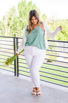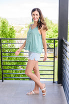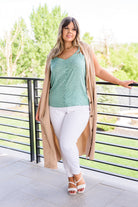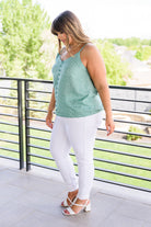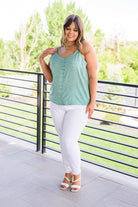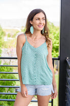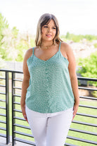 A trend that will never go out of style! Polka dots are truly here to stay, and the Top Floor Tank is the perfect pick for your closet! In a stunning sage green decorated in tiny white polka dots that shapes a v-neckline, button front and a flowy silhouette. Perfect for those hot summer days!