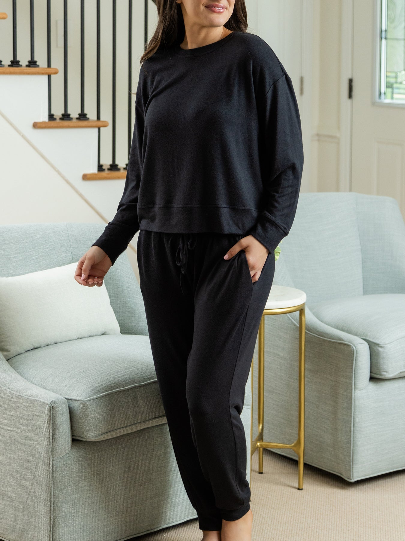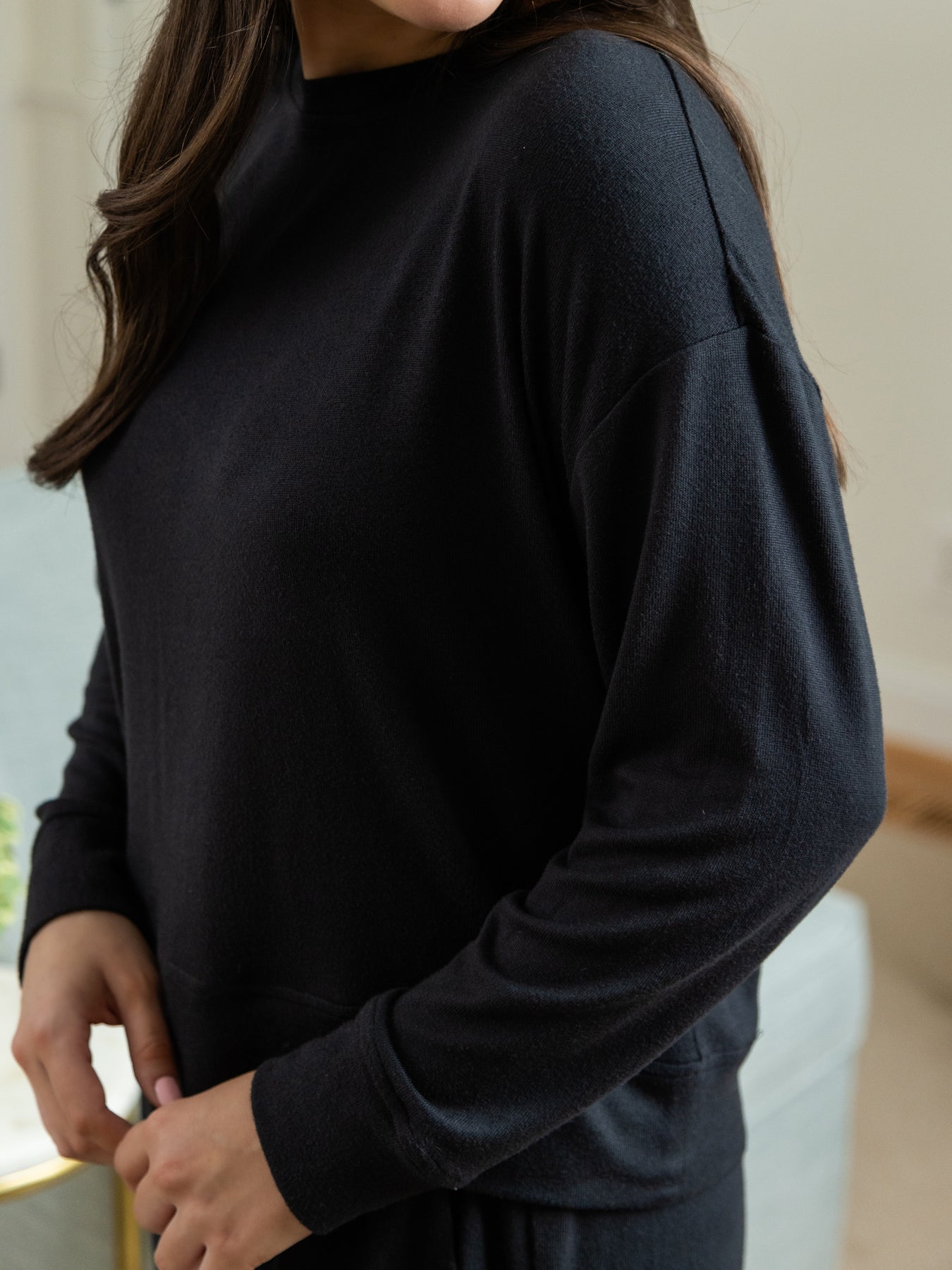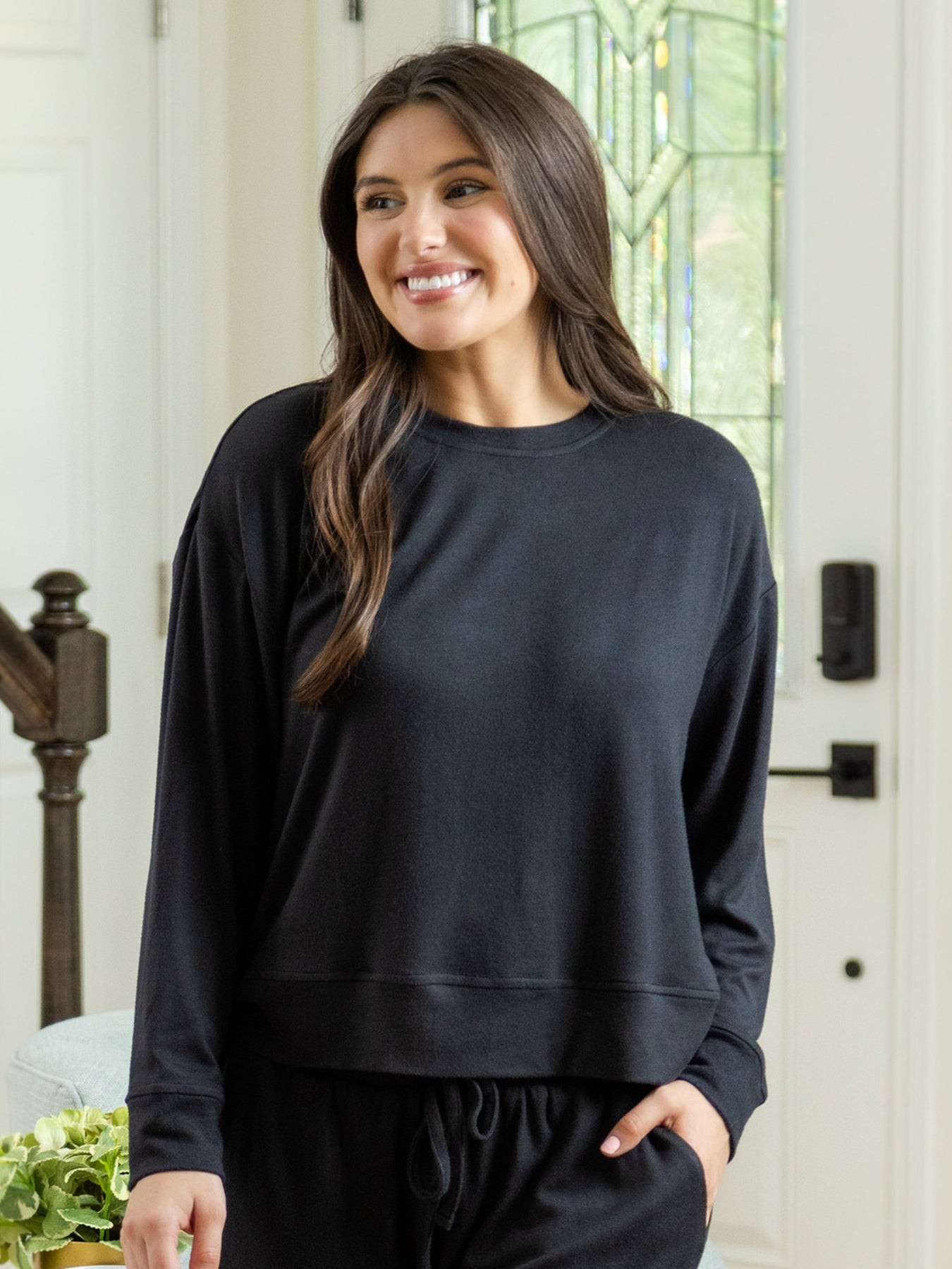 Introducing the Sophie Top, the latest addition to our loungewear collection. This top combines unmatched luxury and comfort, making it your top choice for effortless lounging and stylish relaxation. The Sophie Top, featuring a relaxed fit and classic round neckline, pairs perfectly with the matching pants for a coordinated look.