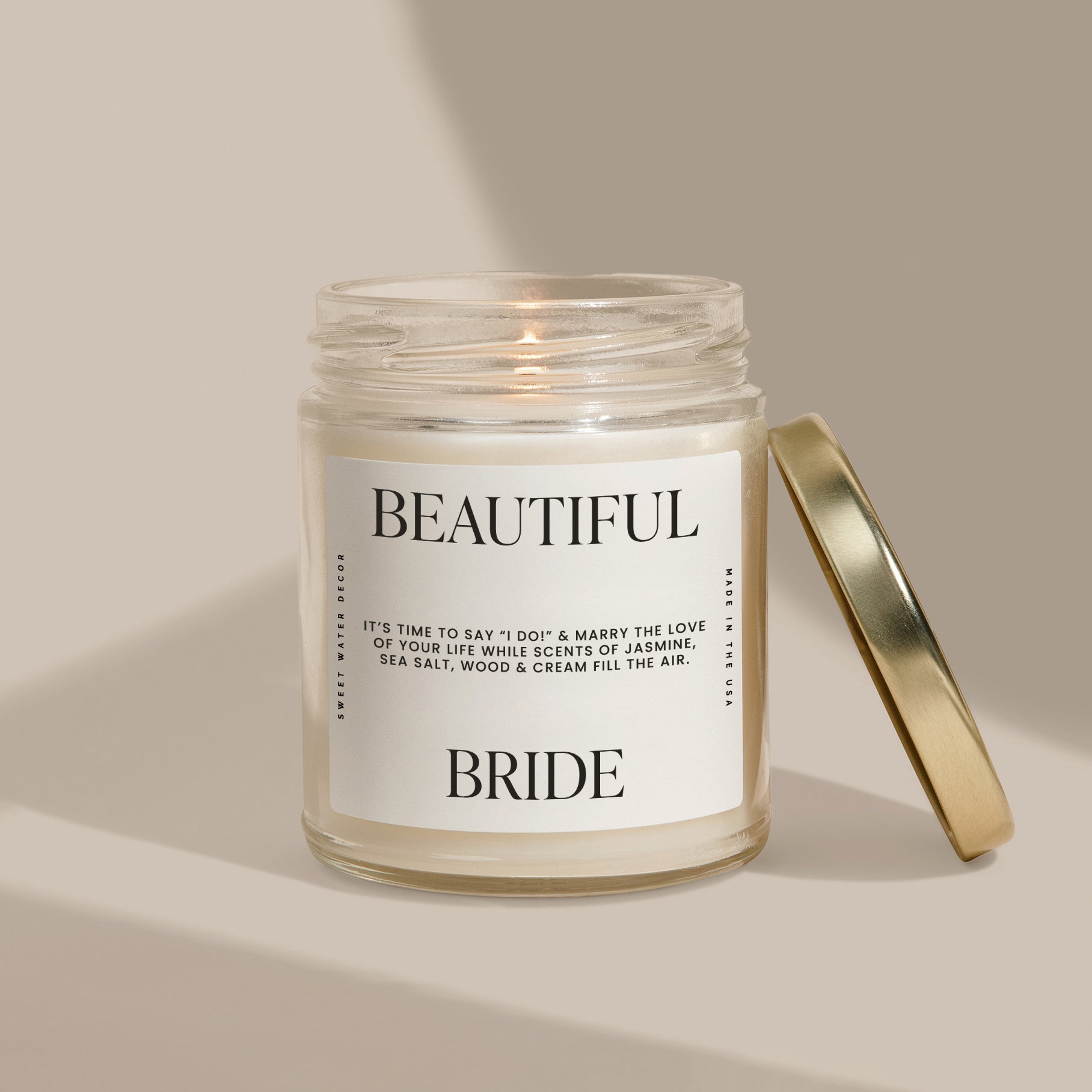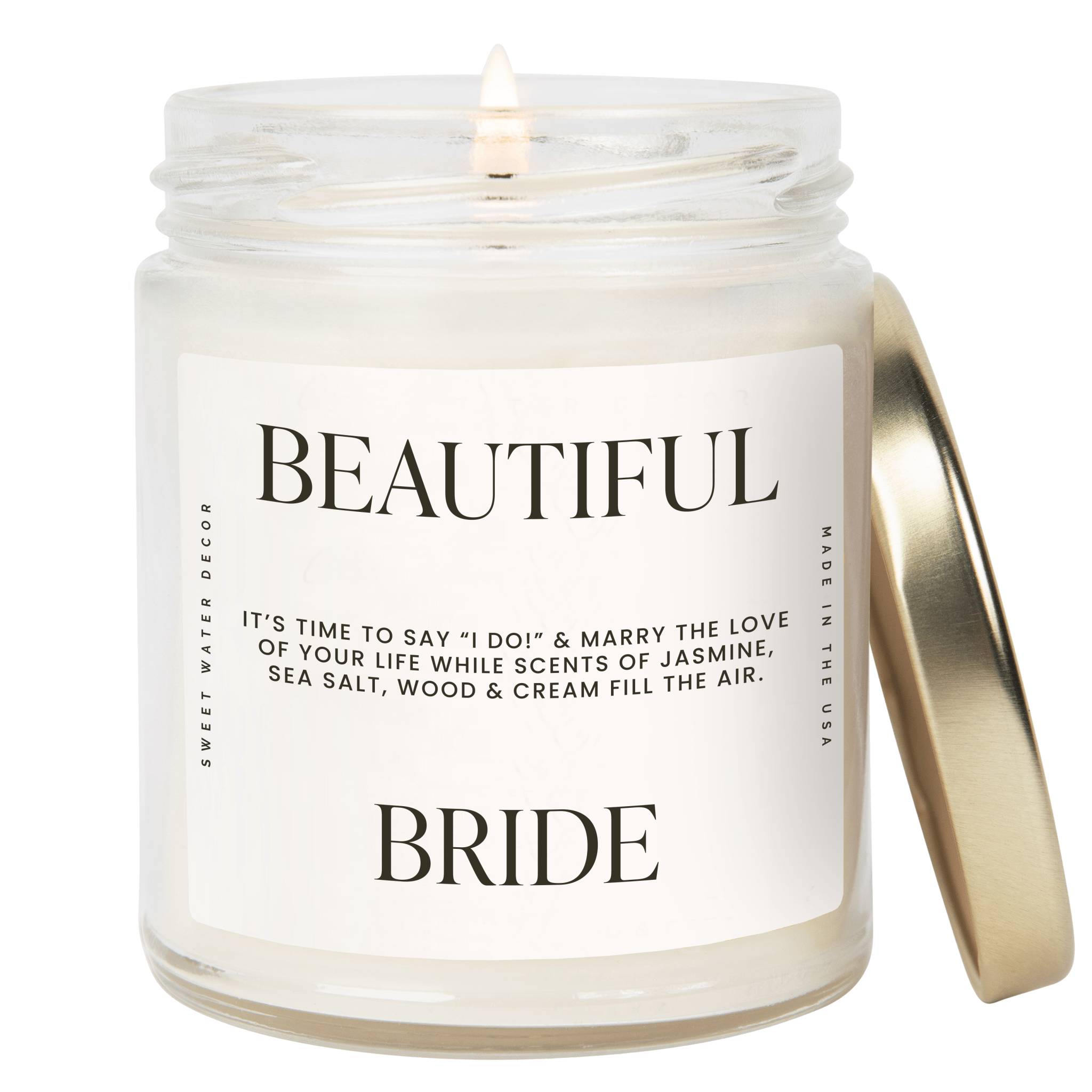 Our Beautiful Bride soy candle is exactly the scent you want wafting in the background of your big day. It features our signature Spa Day scent, which has calming notes of jasmine, sea salt, wood and cream. Buy it for yourself, or gift it to your engaged BFF. It makes a wonderful wedding gift, engagement gift, and bridal shower gift!