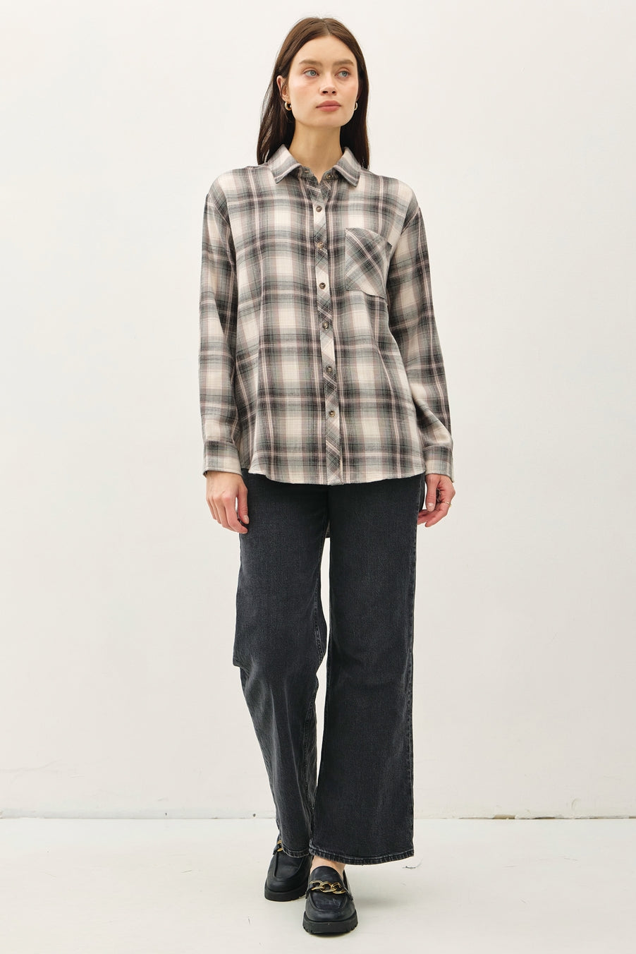 Keep your style on lock and your secrets cozy with the Jade Oversized Plaid Shirt. This lightweight flannel features a button down design with a single front pocket and drop shoulder, perfect for endless styling options. (Don't worry, we won't tell anyone you're wearing the same shirt two days in a row)!