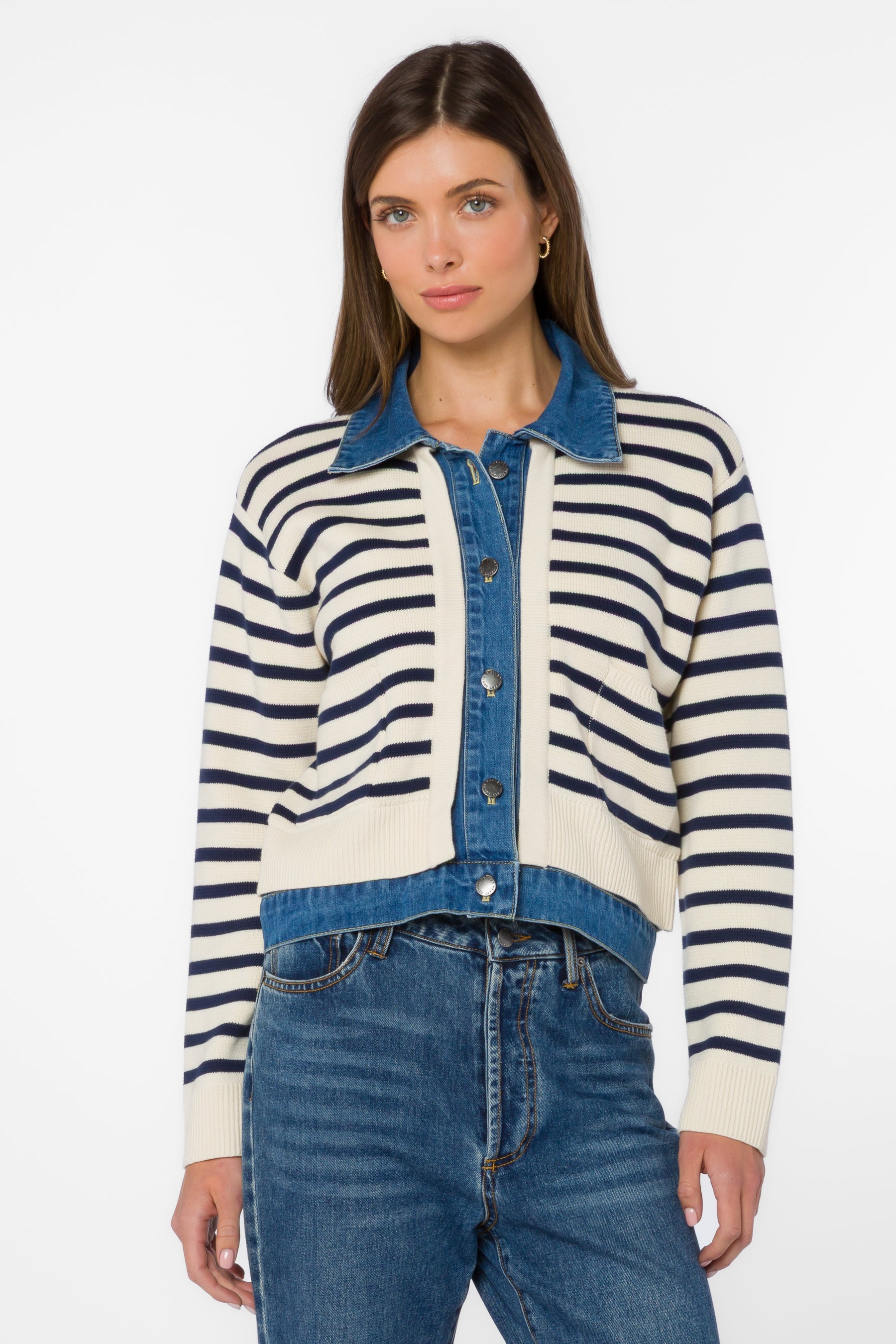 Effortlessly cool with a cozy twist, the Ivory Blue Mixed Media Jacket is the perfect blend of soft texture and structured style. Designed with long sleeves and a mixed media construction, this button-up jacket features navy-inspired stripes paired with classic denim details for a timeless yet modern look.
