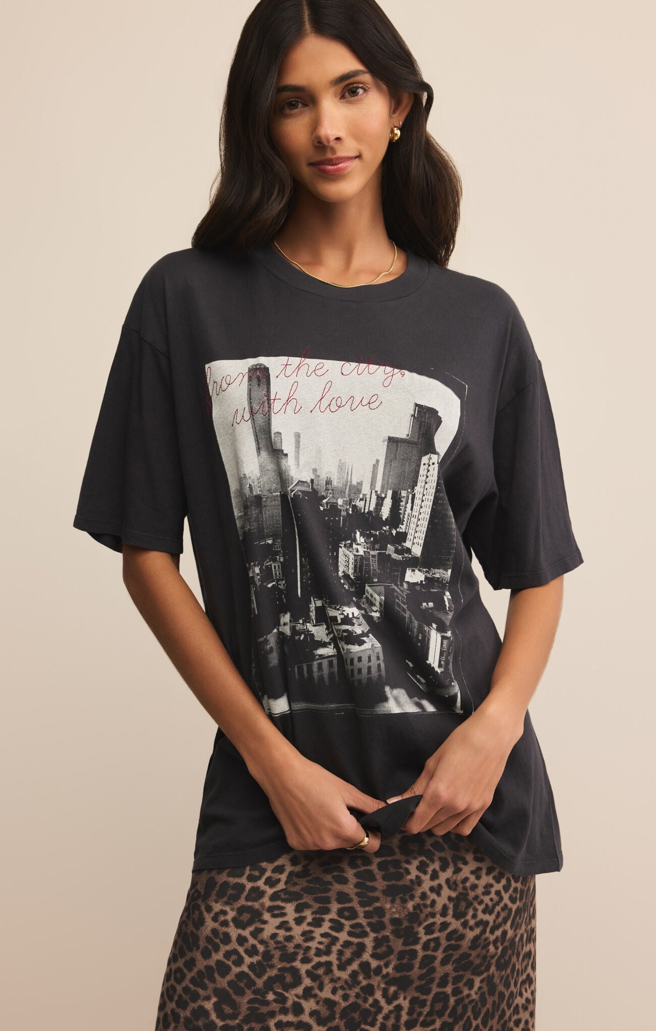 Easy, lived-in, and ready for wherever the day takes you. This short sleeve tee is made from soft cotton jersey with a vintage wash and features a bold New York City skyline graphic front and center for a blend of laid-back cool and big city energy.