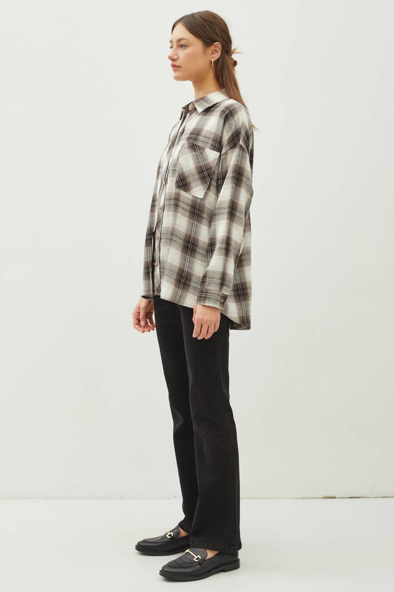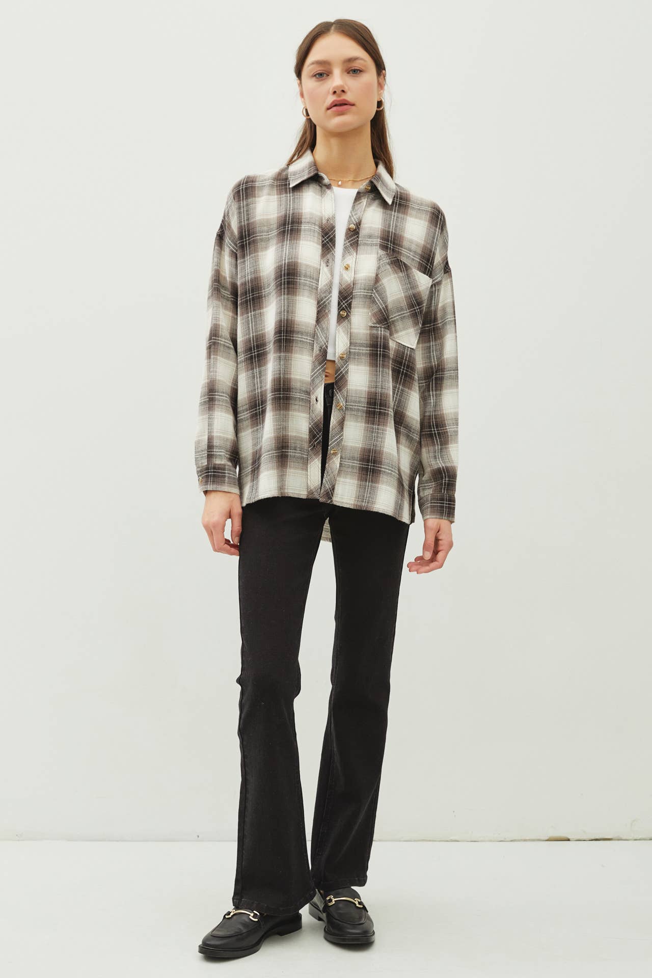 Stay comfy and stylish with our KEEPING YOU WILD oversized flannel! Choose from brown or charcoal plaid, made from lightweight, ultra soft fabric (no stretch). Button down with a single front pocket, cuffed sleeves and collar, and a round hem with side slit. Get ready to rock the lumberjack look (without sacrificing comfort)!