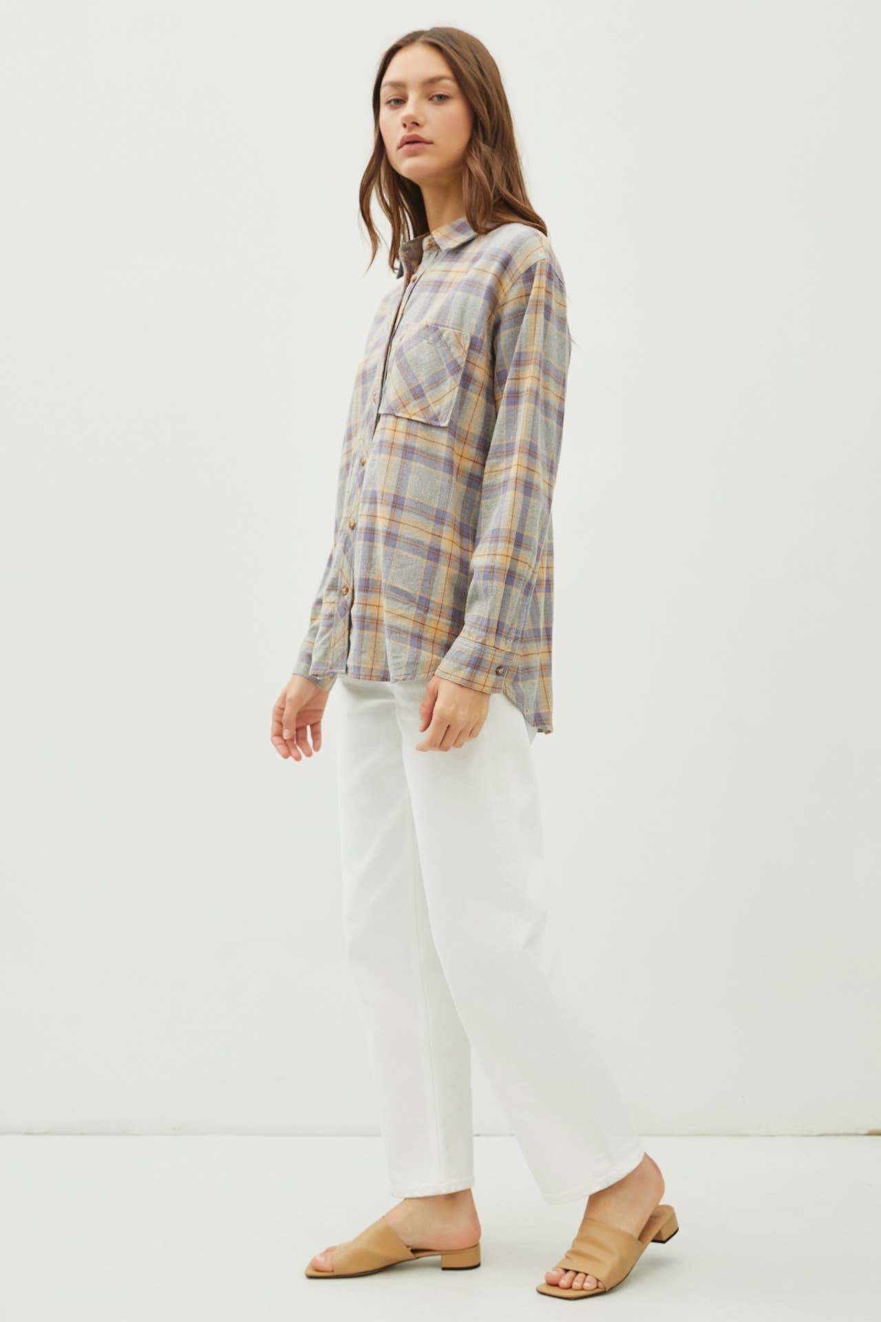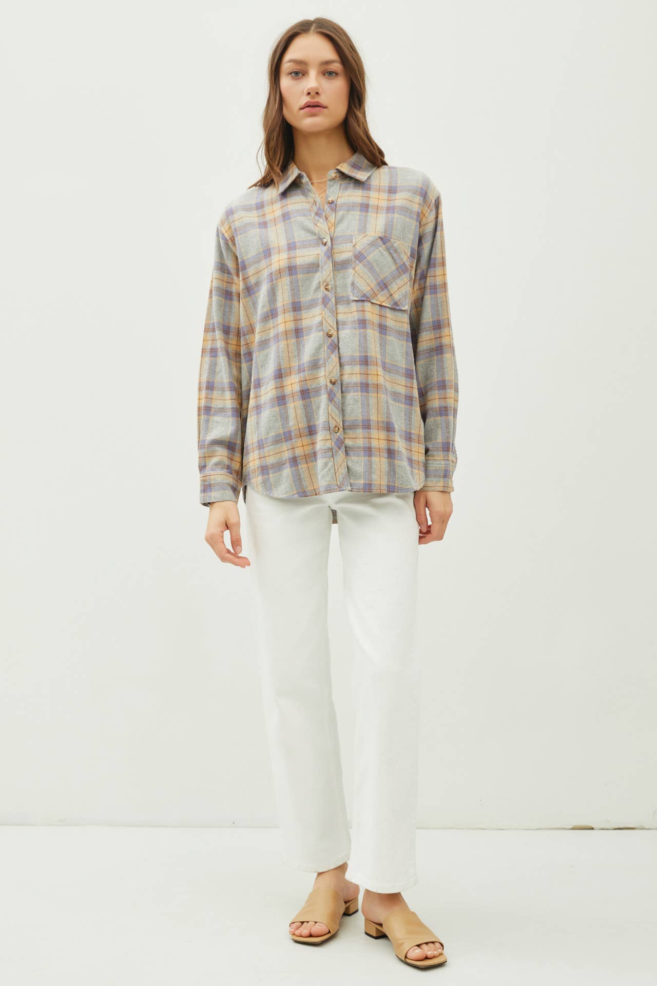 Looking for cozy comfort with a touch of style? Our NO COMPARISON OVERSIZED PLAID FLANNEL has got you covered. Crafted from ultra soft lightweight fabric in Heather Grey, Slate Blue, Beige, and Rust Plaid, this button down features a cuffed sleeves, collar, and single front pocket. (Stay warm and trendy all season long!)