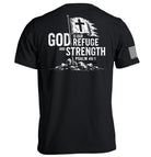 Due to available t-shirt stock we use different t-shirt brands depending on availability. Please be aware that this causes size variation between brands.God is our Refuge and Strength (Online Exclusive)