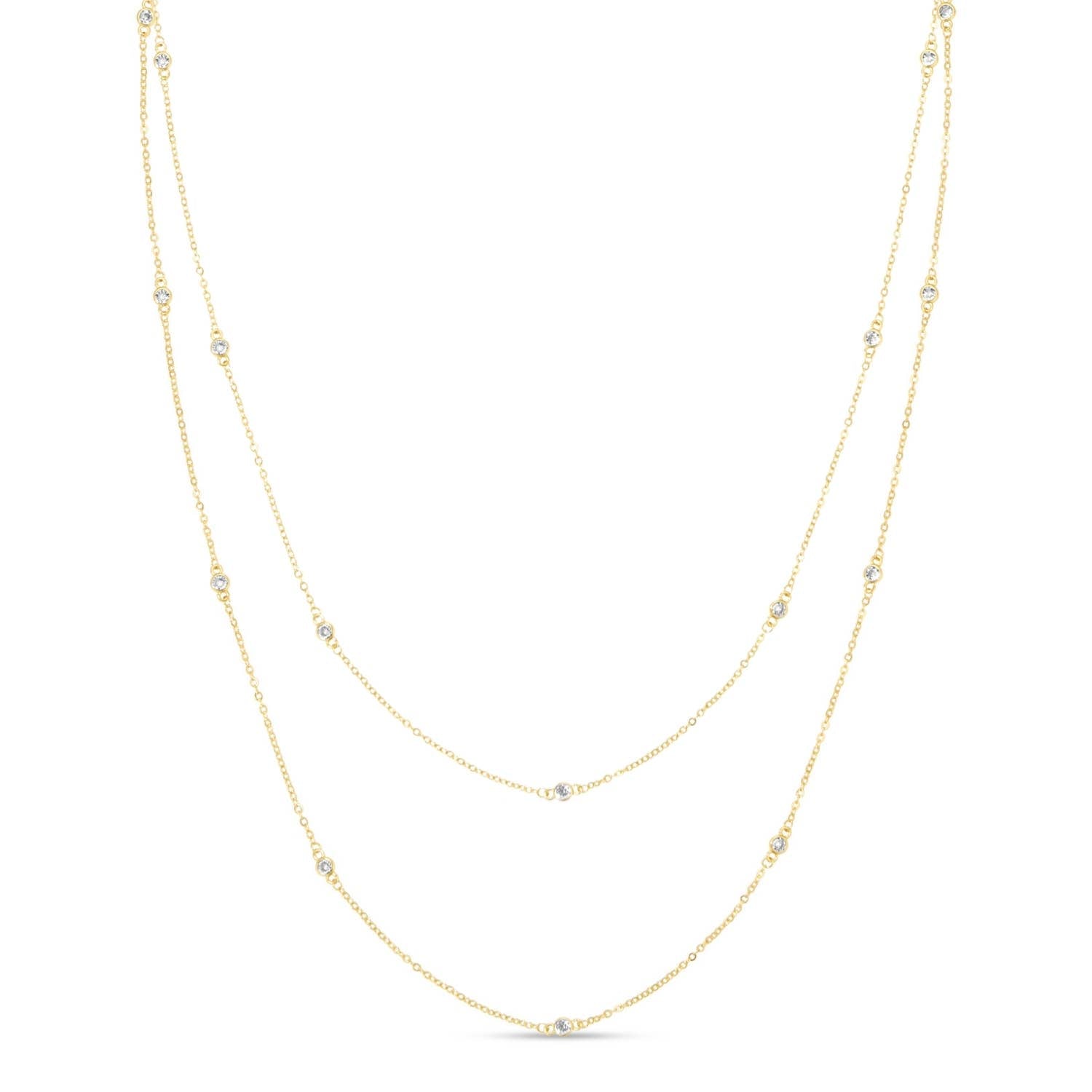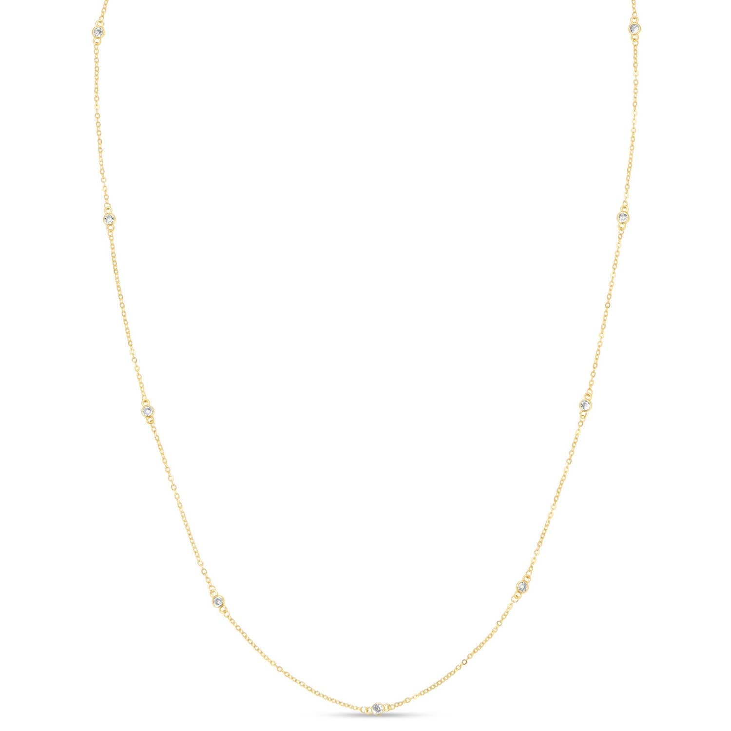 Elegant length with dazzling detail. The Long Cubic Zirconia Accented Necklace features a sleek, extended chain adorned with sparkling cubic zirconia accents, all beautifully plated in radiant 18k gold for lasting shine. This necklace adds refined glamour and a touch of sparkle to any outfit.