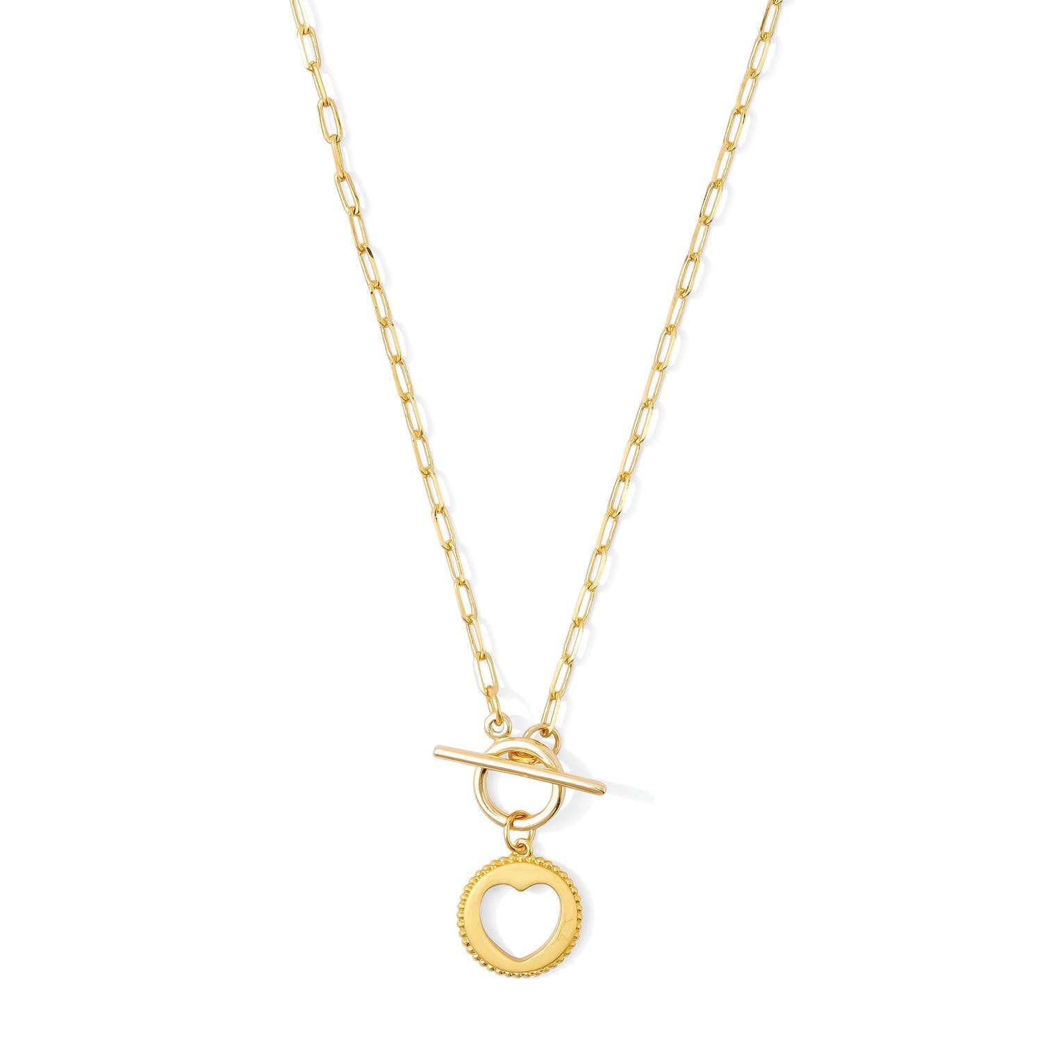 Elevate your everyday look with the Heart Paperclip Toggle Necklace, crafted with delicate 18k gold plating for a luxurious finish. Featuring a trendy paperclip chain and a charming heart pendant, this necklace adds a touch of modern romance to any outfit.