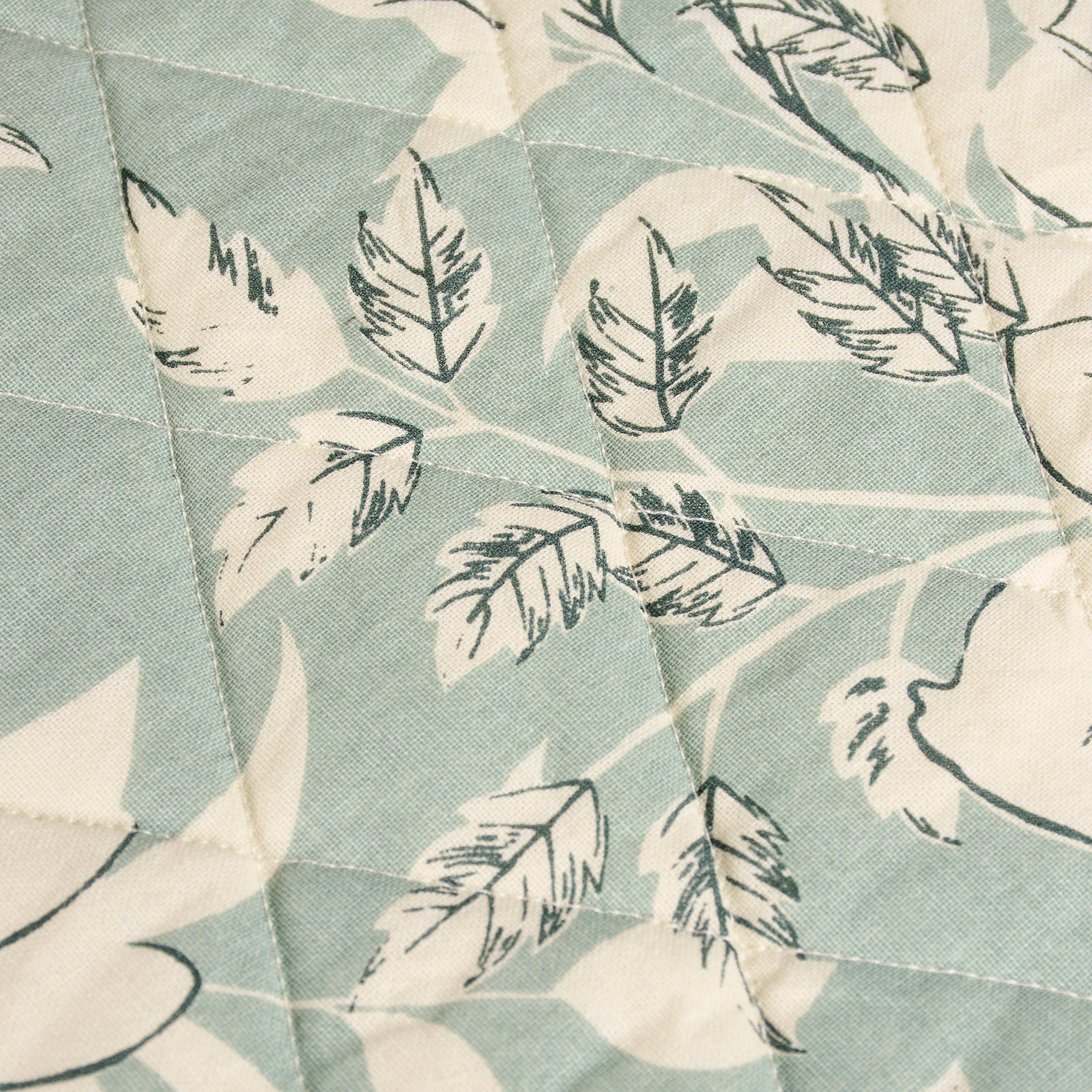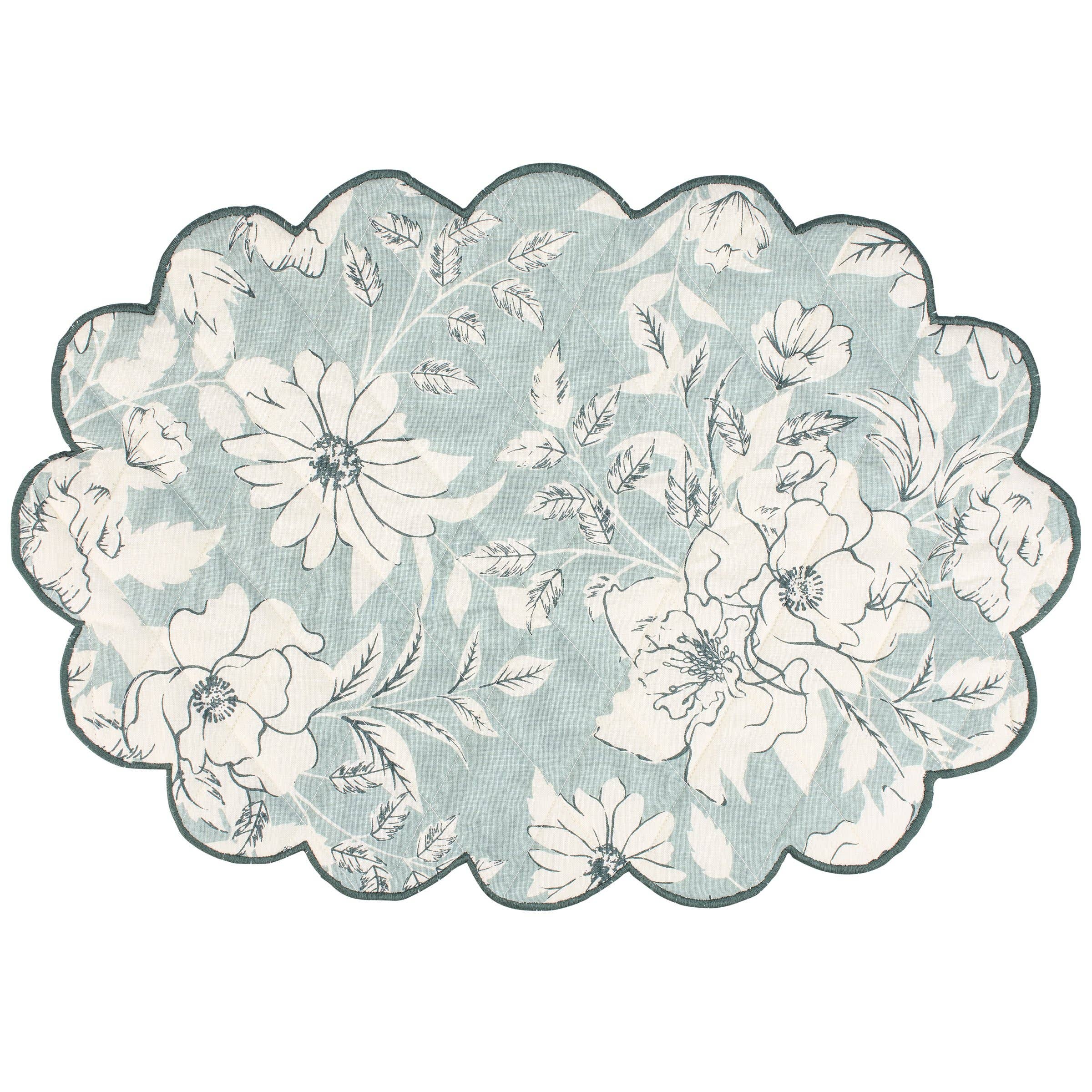 A double-sided cotton placemat from our Botanical Collection displaying a floral inspired vintage pattern in a blue color palette and coordinating blue and cream stripe pattern on the back with quilted details on both sides and scalloped edge made with blue thread. Our Blue Floral cotton placemat set is conveniently machine-washable for easy cleaning. A vintage tabletop accessory perfect for customizing everyday place settings.