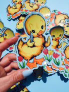 This funny vinyl sticker features a pastel yellow duck holding a glitter knife surrounded by tulips — a vibe we call “sparkly danger.” Whether you’re decorating your laptop, water bottle, or trauma journal, this duck means business.