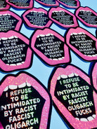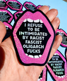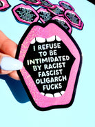 Loud. Proud. Unapologetically pissed off. The “I Refuse to Be Intimidated by Racist Fascist Oligarch Fucks” sticker isn’t here to whisper—it’s here to scream.