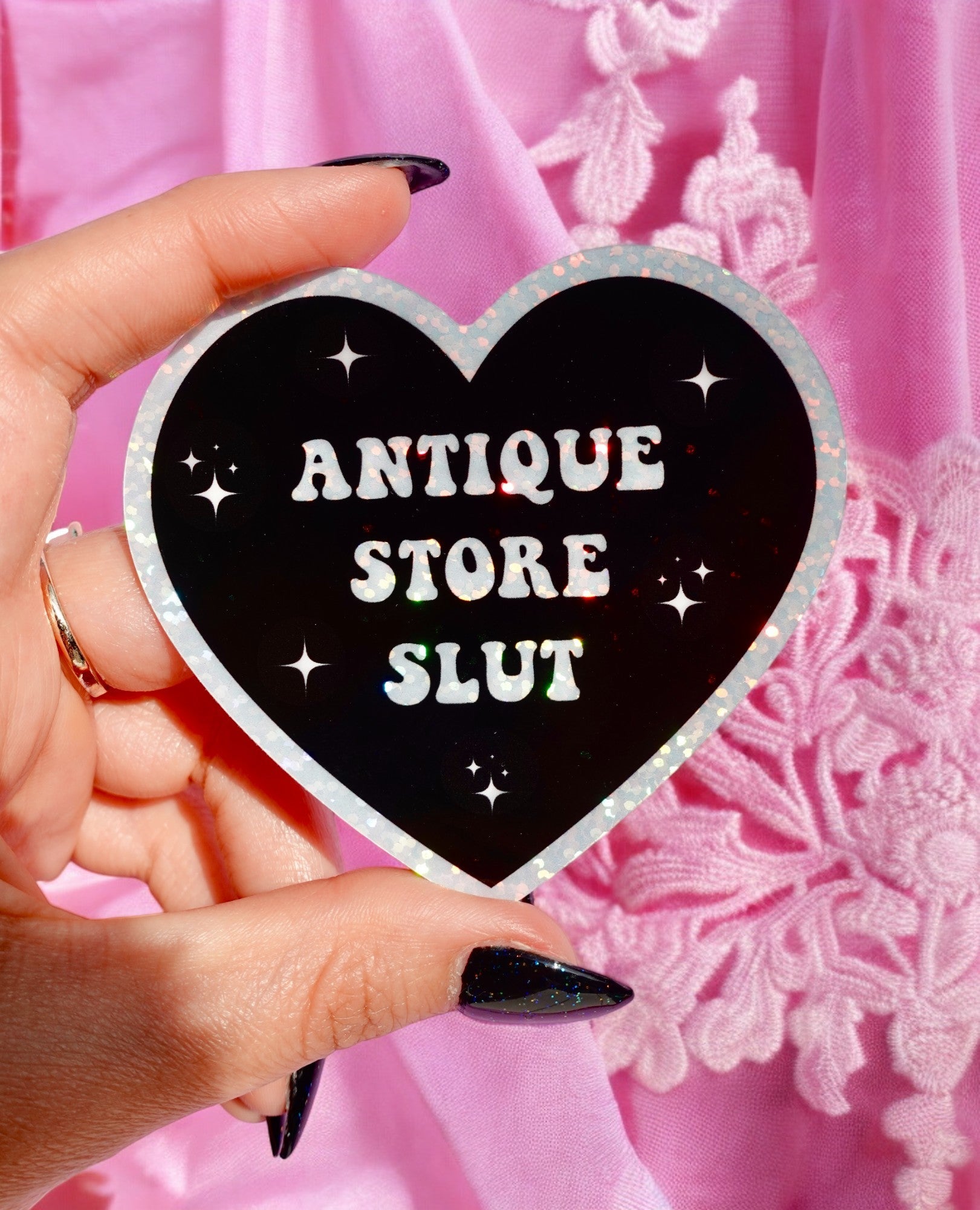 This holographic heart vinyl sticker is a sparkly declaration of your deep, carnal love for dusty treasures, vintage tchotchkes, and haunted furniture. Whether you’re prowling for a mismatched teacup or a cursed oil painting of a Victorian child, this one’s for you.