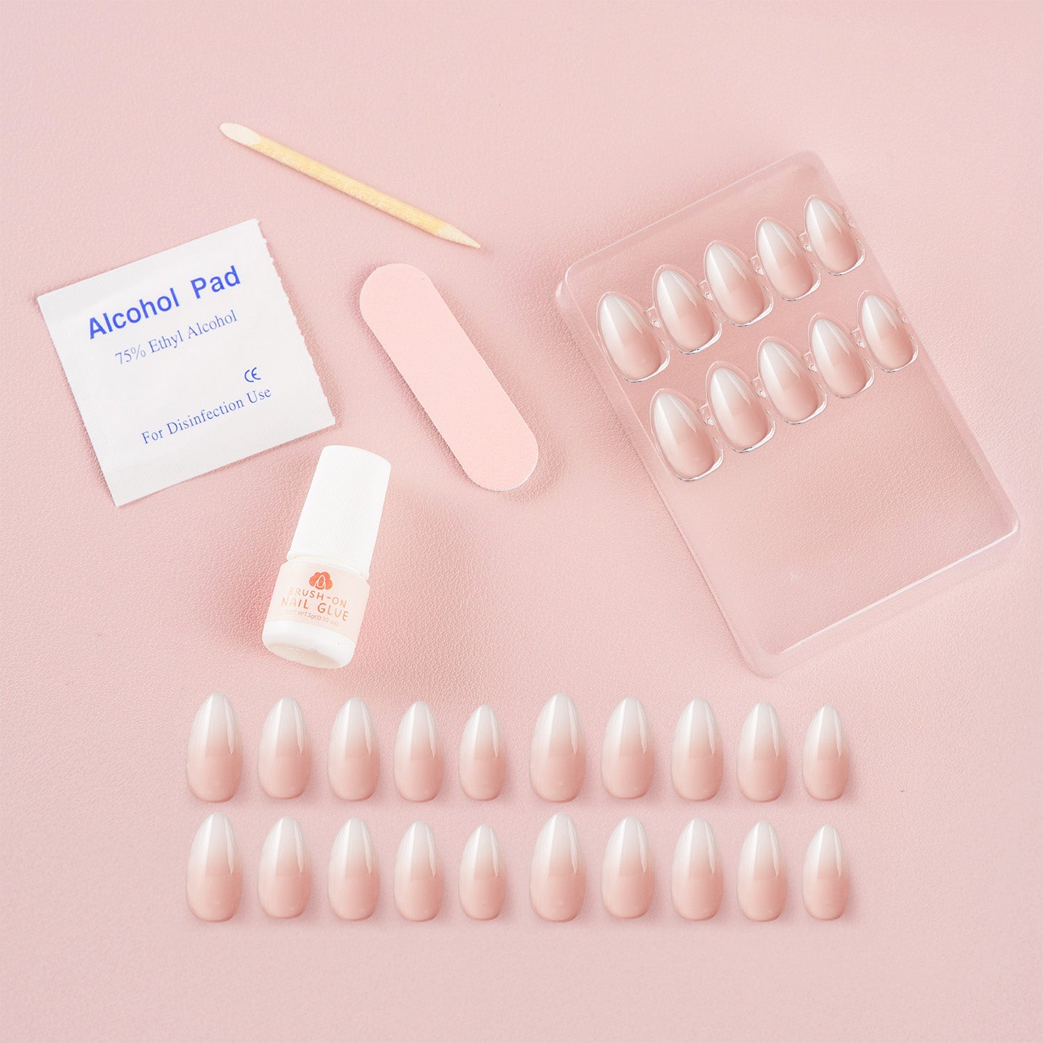 Demure press on nails feature a subtle yet stylish pink to white ombre design that adds a touch of class and cuteness to any look. Say goodbye to boring nails and hello to Demure's playful sophistication.