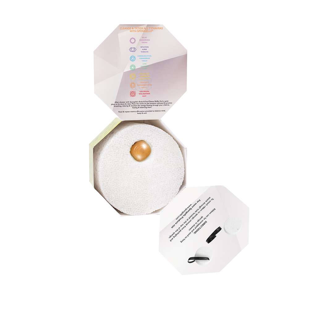 Enrich your daily bathing practice with the spiritual power of cleansing, buffing, and detoxing. Spongellé’s® Spiritual Detox Buffer in Mystic Ginger promotes wisdom and self-confidence. It contains Ashwagandha Root Extract, orange and ginger, and the good fortune of yellow jade. Use the enclosed solar plexus chakra stone while meditating, soothing anxiety, and manifesting desires.