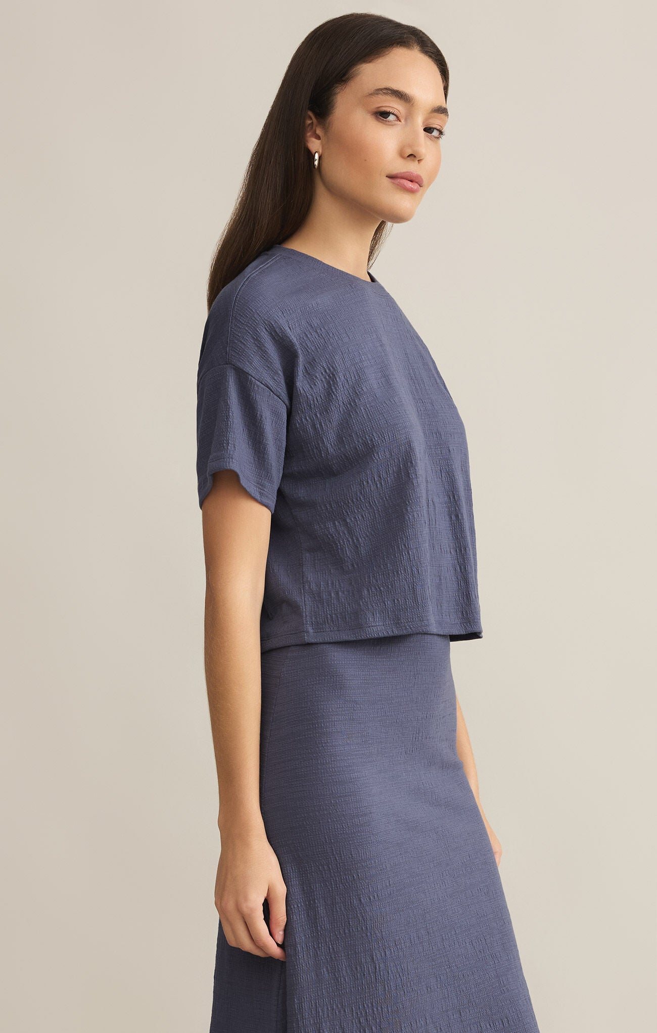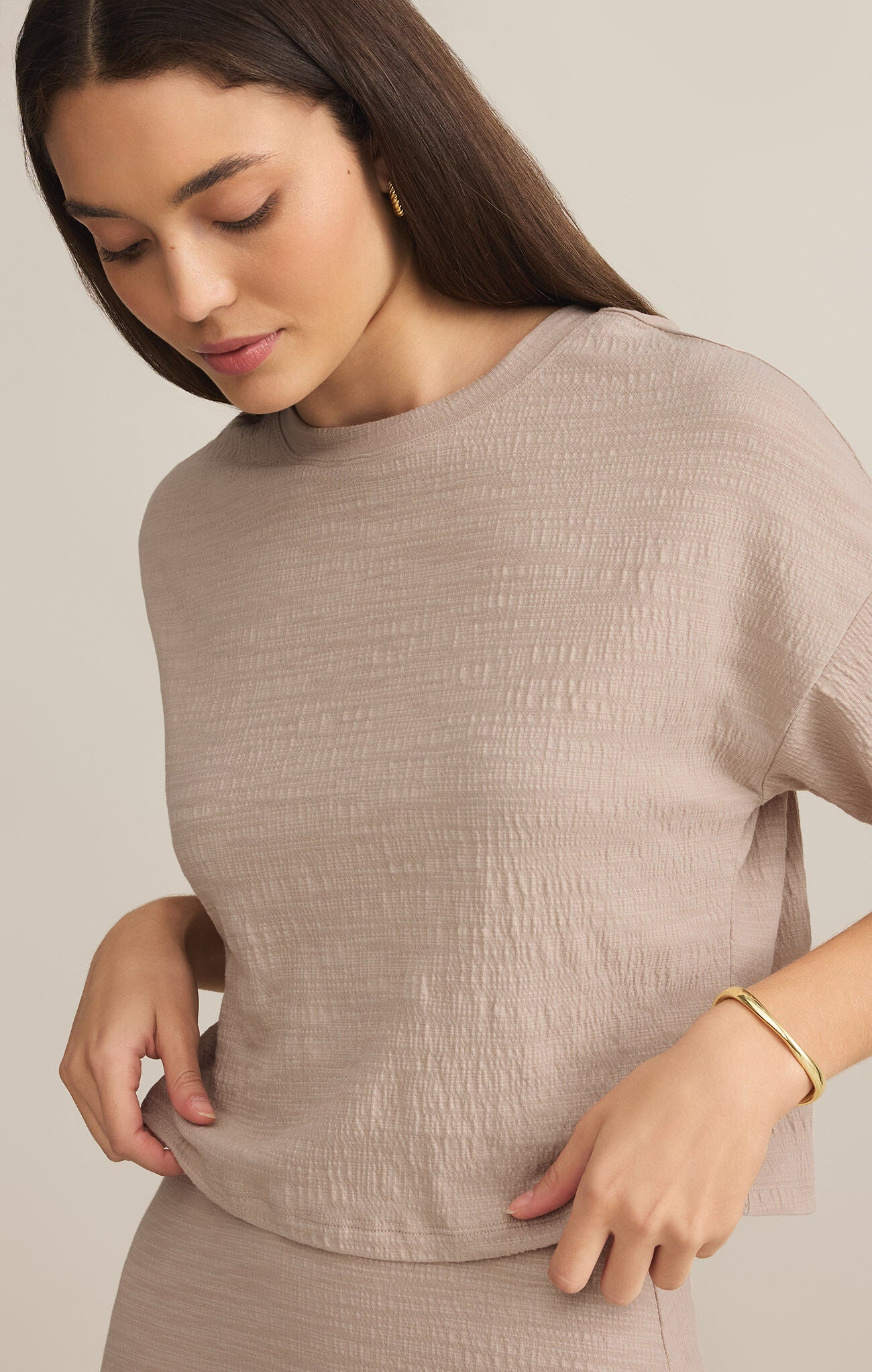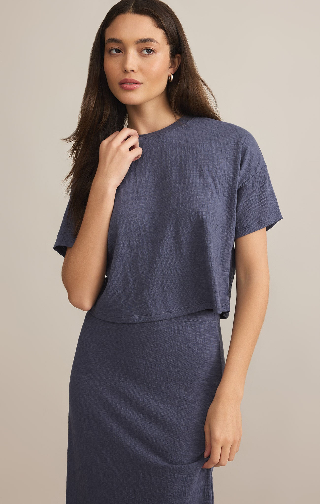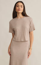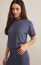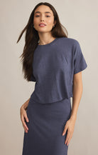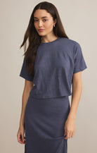 This cropped crewneck tee is all about texture and flow, with drapey, relaxed sleeves and slub knit fabric. A laid-back essential for a relaxed, off-duty vibe.