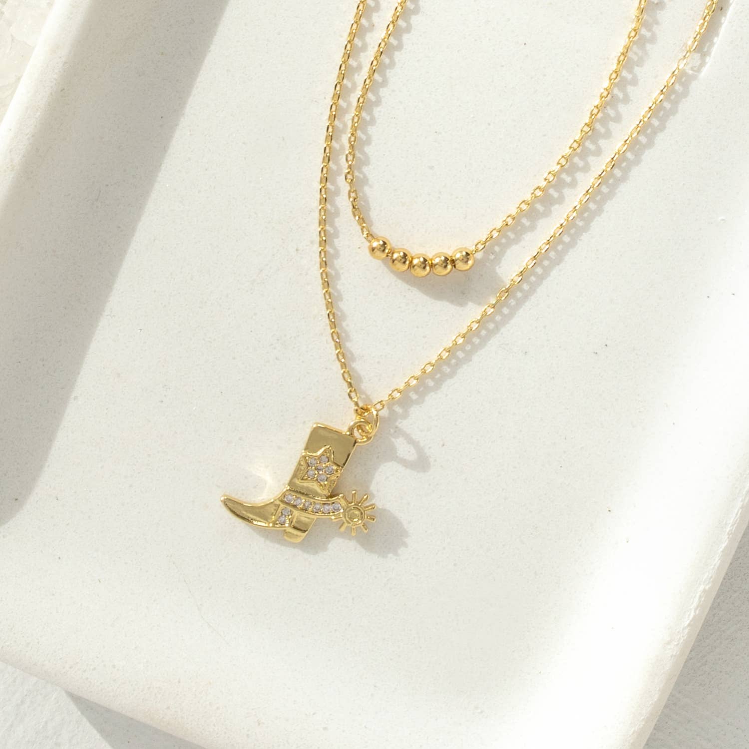 Western-inspired sparkle with modern flair. The Glitzy Cowgirl Boot Double Necklace features a charming cowgirl boot pendant adorned with dazzling cubic zirconia, paired with a delicate layered chain design—all beautifully finished in luxurious 18k gold plating.