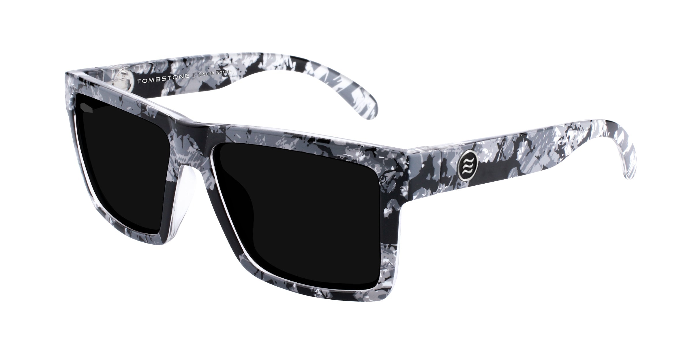 The abstract greyscale camo TR90 frames channel the grungy edge of Long Island surf towns like Montauk. Signature coffin icons nod to Tim's brand Tombstone Hardware while adding his signature gothic flair. The more traditional rectangular shape evokes the region's adventurous surf culture. Whether you're paddling out at dawn in the Rockaways or rolling with your crew in the Hamptons, the South Shores fuse effortless cool with a gritty coastal vibe.