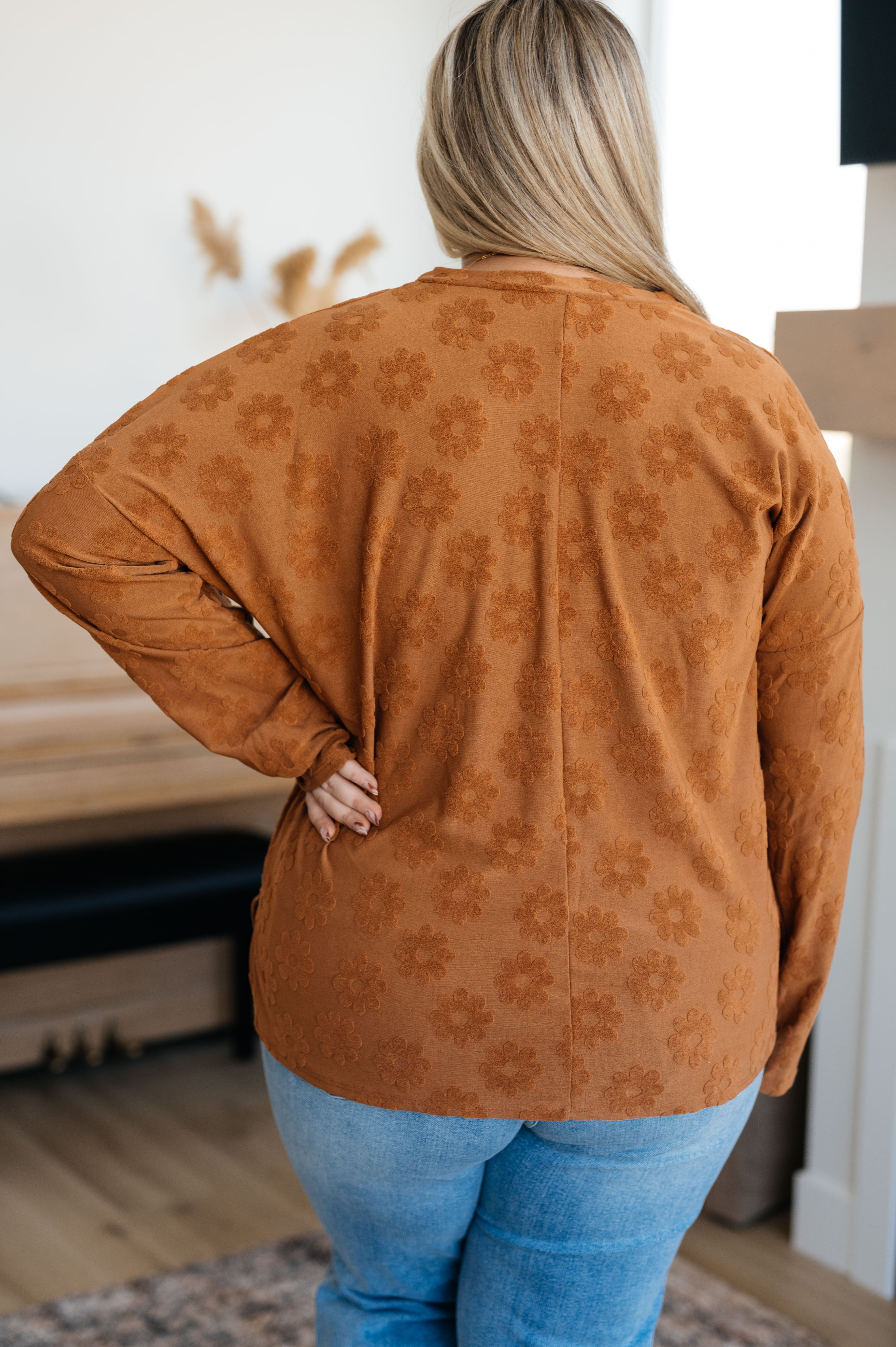 Our Perfect in Pansies V-Neck Top is a delightful way to add a subtle pop of fun to your wardrobe. The textured burnout floral pattern is on a stretchy knit fabrication, making it comfortable and stylish. With long sleeves, this top is the ideal choice for the modern woman.