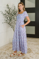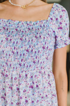 Embrace playful charm with this purple Floral Square Neck Dress. Made from crisp poplin woven fabric, it features a ruffled square neckline and cased elastic shoulders for a comfy fit. Puff sleeves with elastic cuffs add a flirty touch, while the smocked bodice and gathered elastic waistband create a flattering silhouette. Functional side pockets and gathered tiers complete this fun, flowy look perfect for any sunny day.