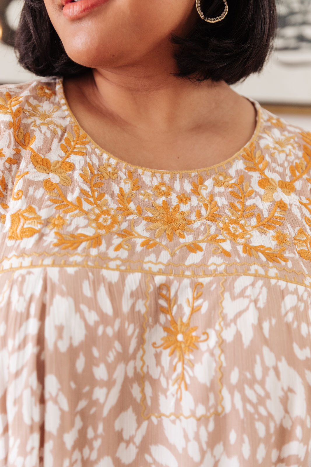 Ce haut chéri nous donne toute l'ambiance bohème chic et nous ne pourrions être plus obsédés ! Un superbe détail brodé orange recouvre un subtil imprimé animal, dans une silhouette fluide à manches longues. Poignets élastiques, ouverture boutonnée au dos, manche ballon, léger.