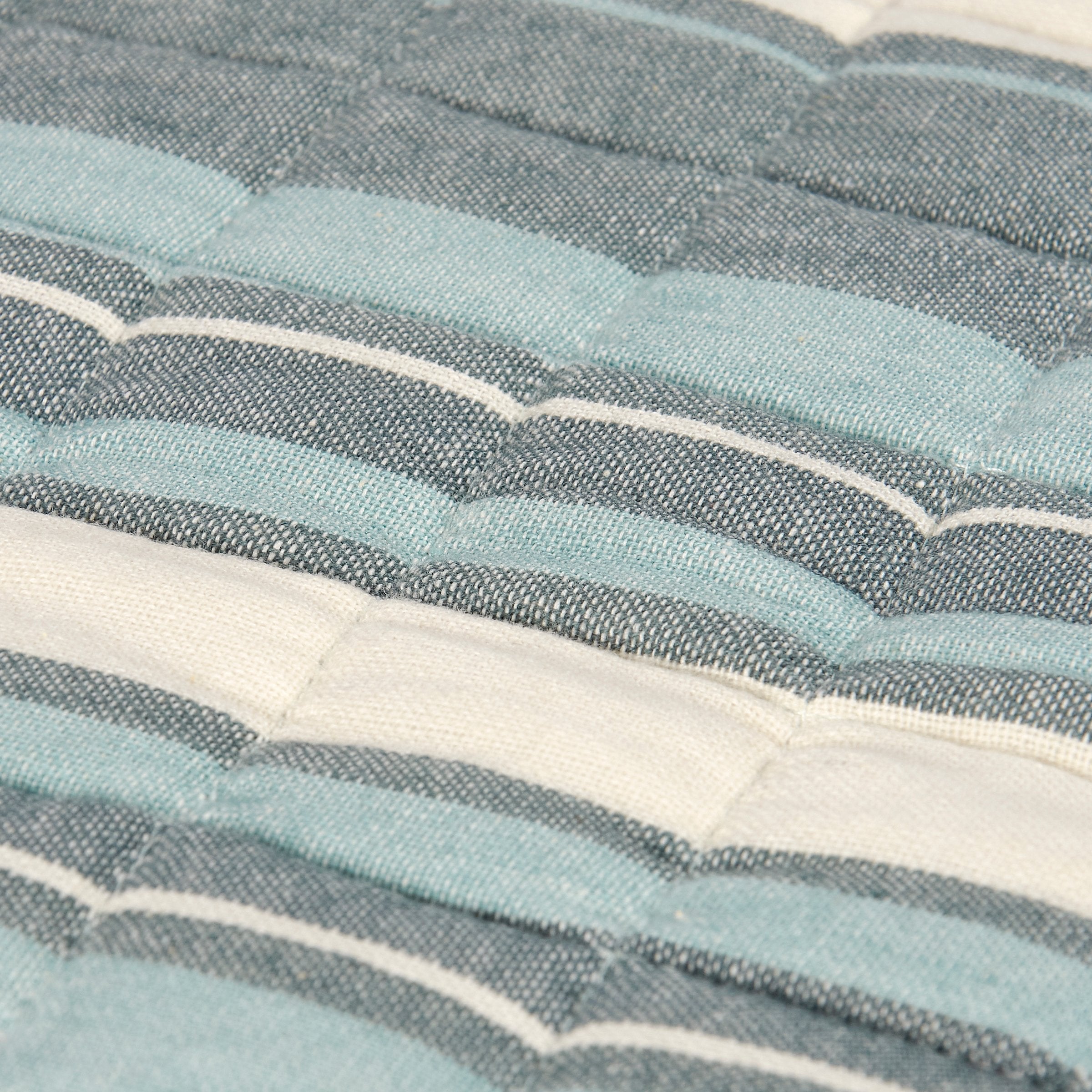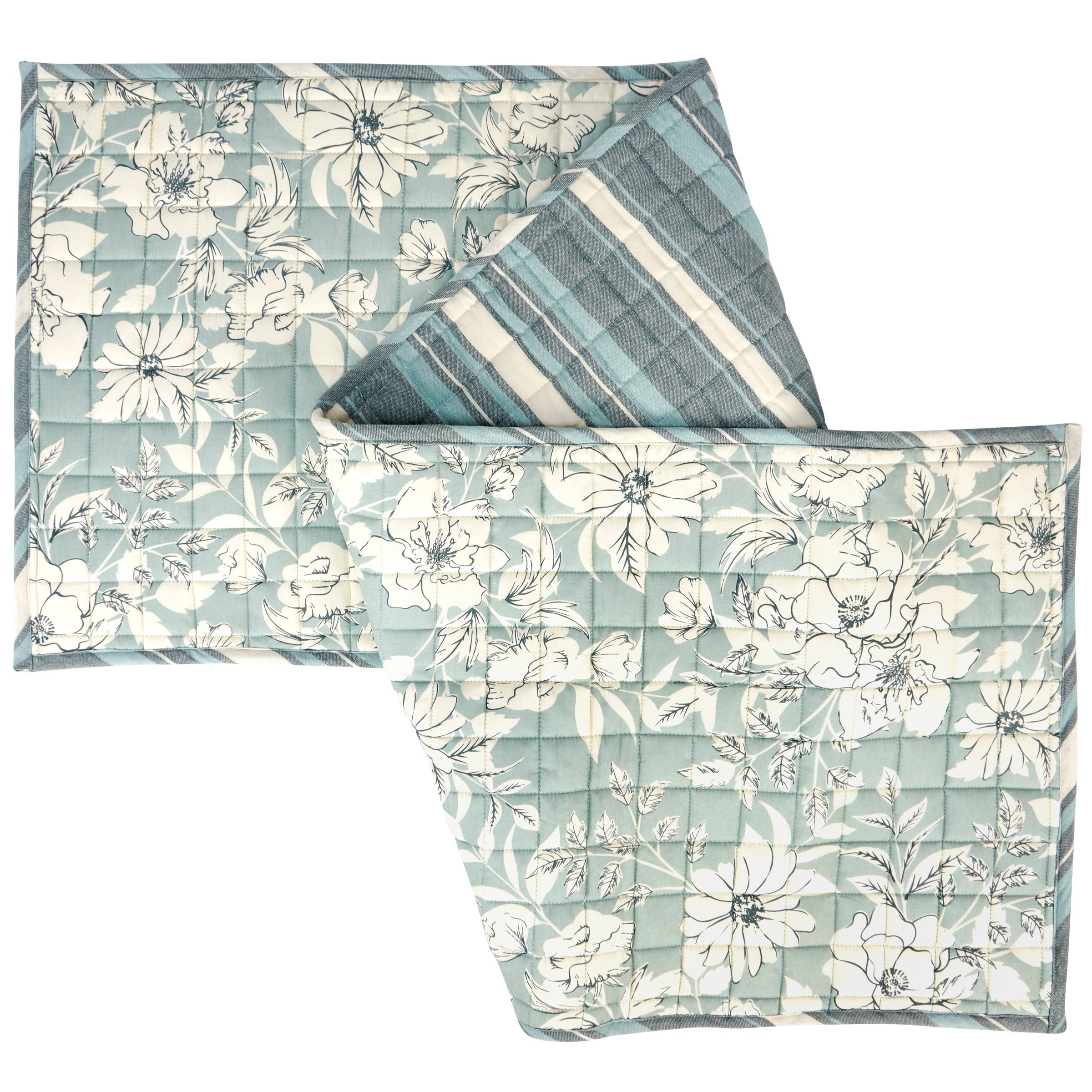 A double-sided cotton runner displaying a floral inspired vintage pattern in a blue color palette and coordinating blue and cream stripe pattern on the back with quilted details on both sides. Floral runner can be used as table décor or as an accent to a home décor display and features 56 inches of length for plenty of coverage. Our Blue Floral runner is conveniently machine-washable for easy cleaning. A vintage floral-themed home accent with a variety of display options.