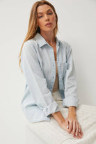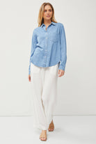 Upgrade your wardrobe with our Important Note Blouse. Light wash chambray fabric provides a stretchy, ultra-soft feel and a relaxed fit. Long sleeves with button closures and a round hem add a touch of sophistication. Perfect for any occasion.