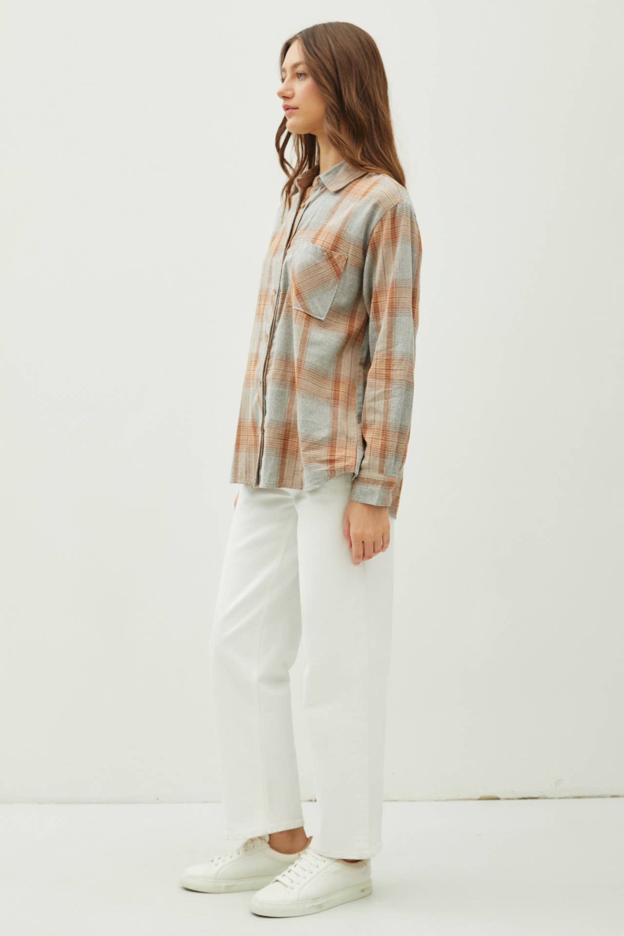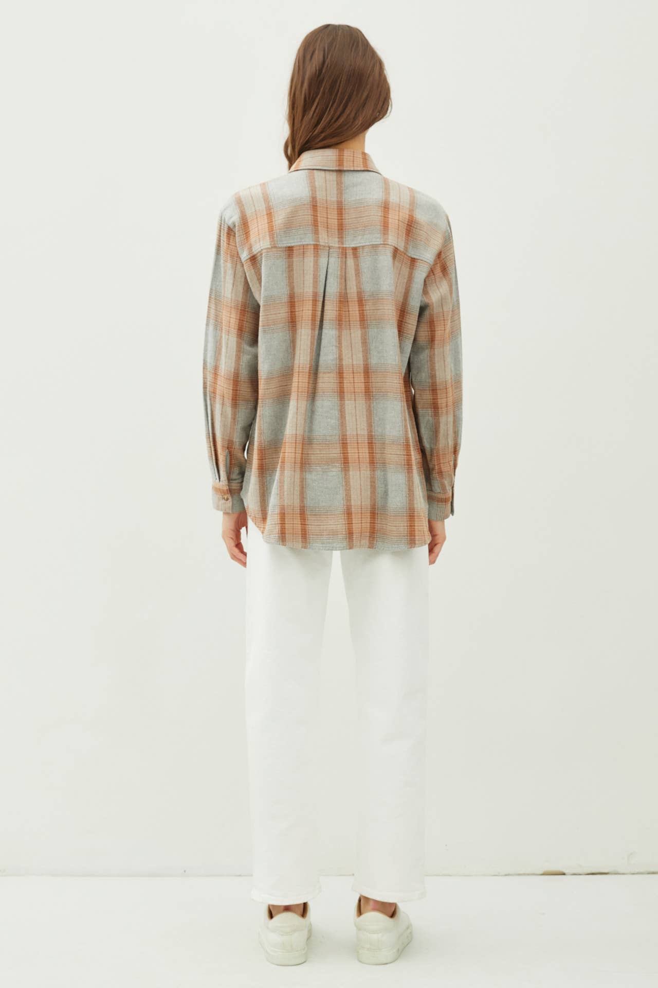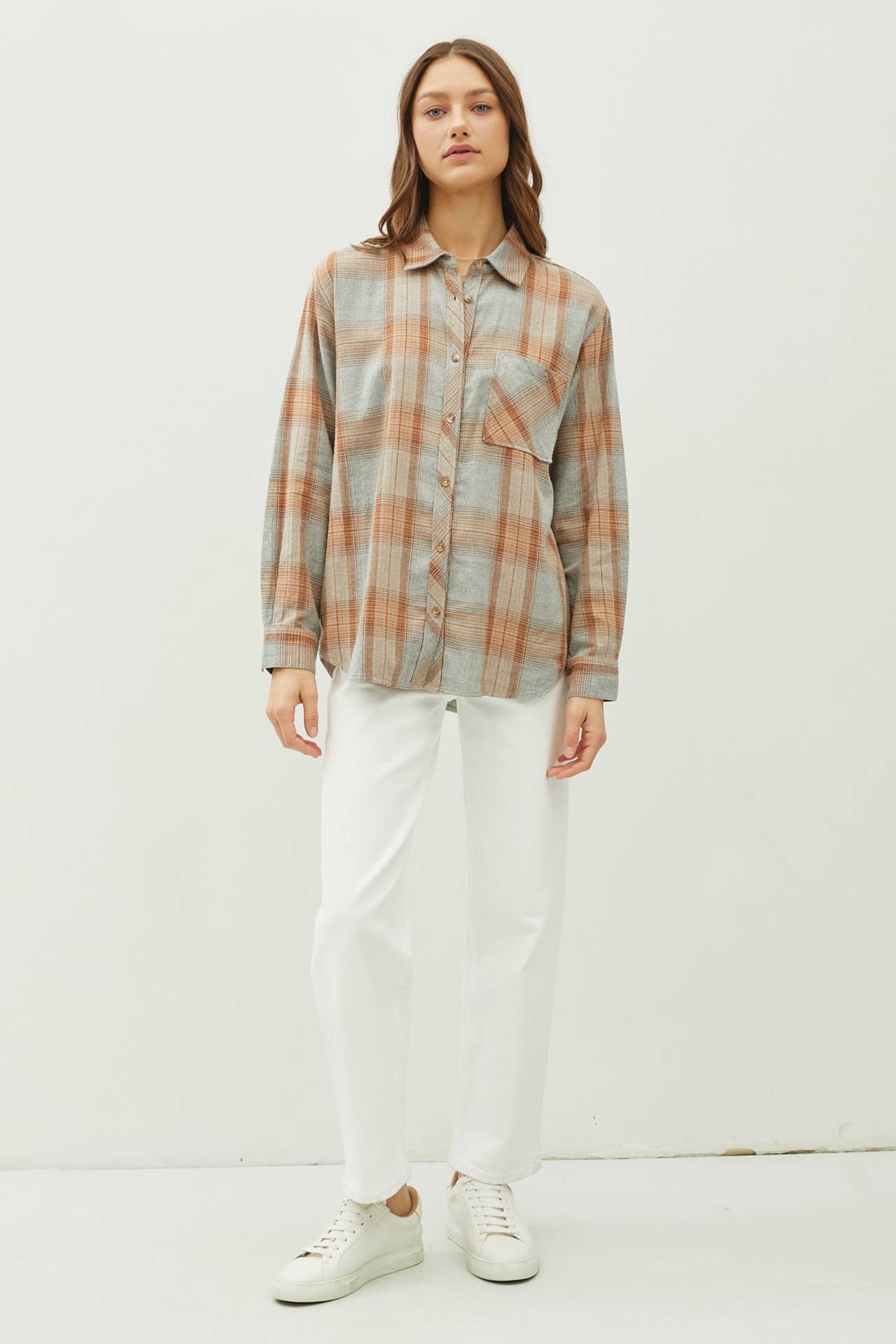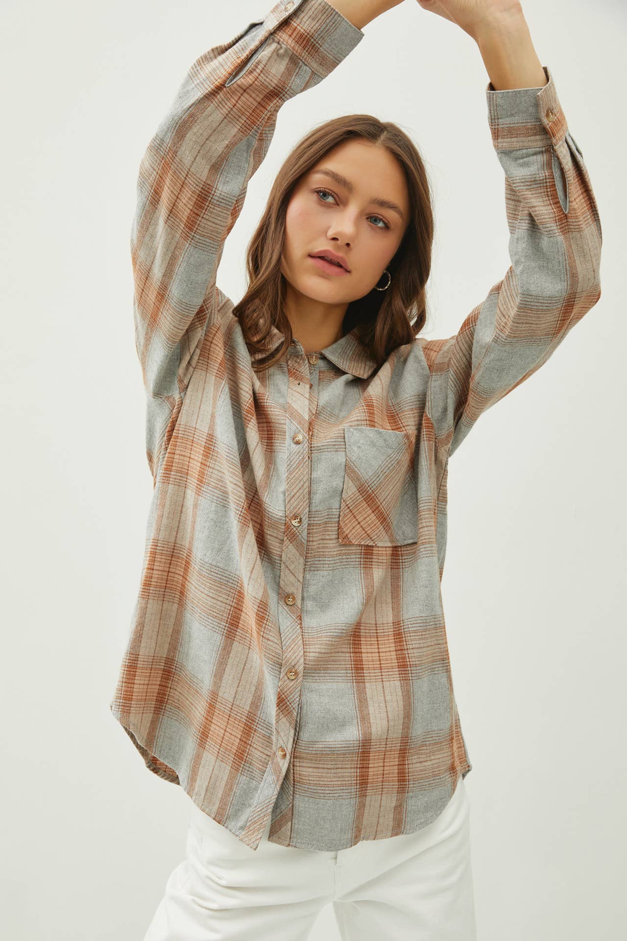 Get cozy with the WISHING ON FOREVER Oversized Plaid Flannel! This lightweight, ultra soft fabric has no stretch and comes in 2 colors. Features include a button down front with a single pocket, cuffed sleeves and collar, and a round hem with side slits. Perfect for looking cute and feeling comfy.